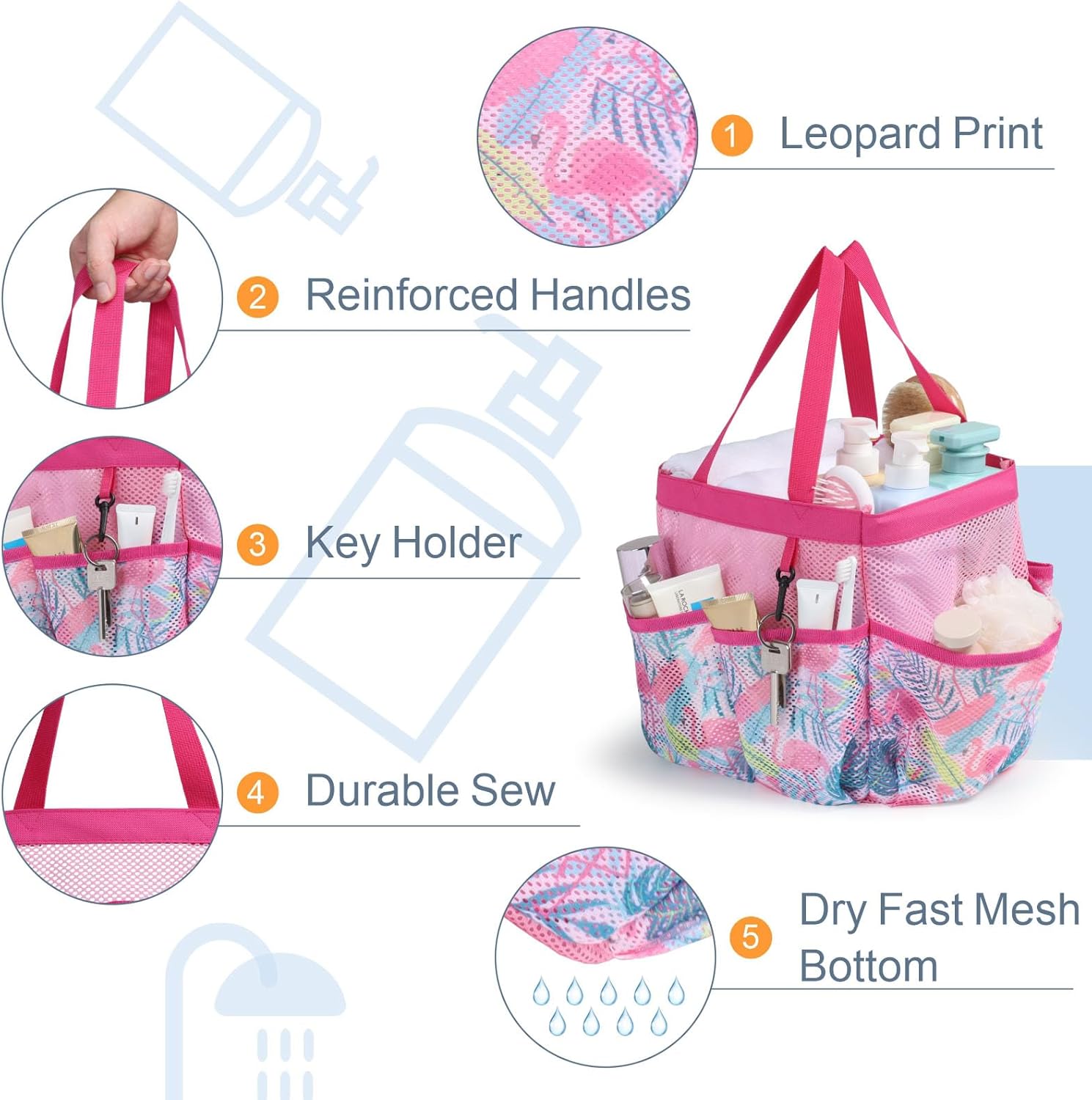 F-color Shower Caddy Portable - Mesh Shower Bag Basket Tote for College Dorm Room Essentials Bathroom Gym Camp Quick Dry for Women Men with S Hook, Pink Flamingo