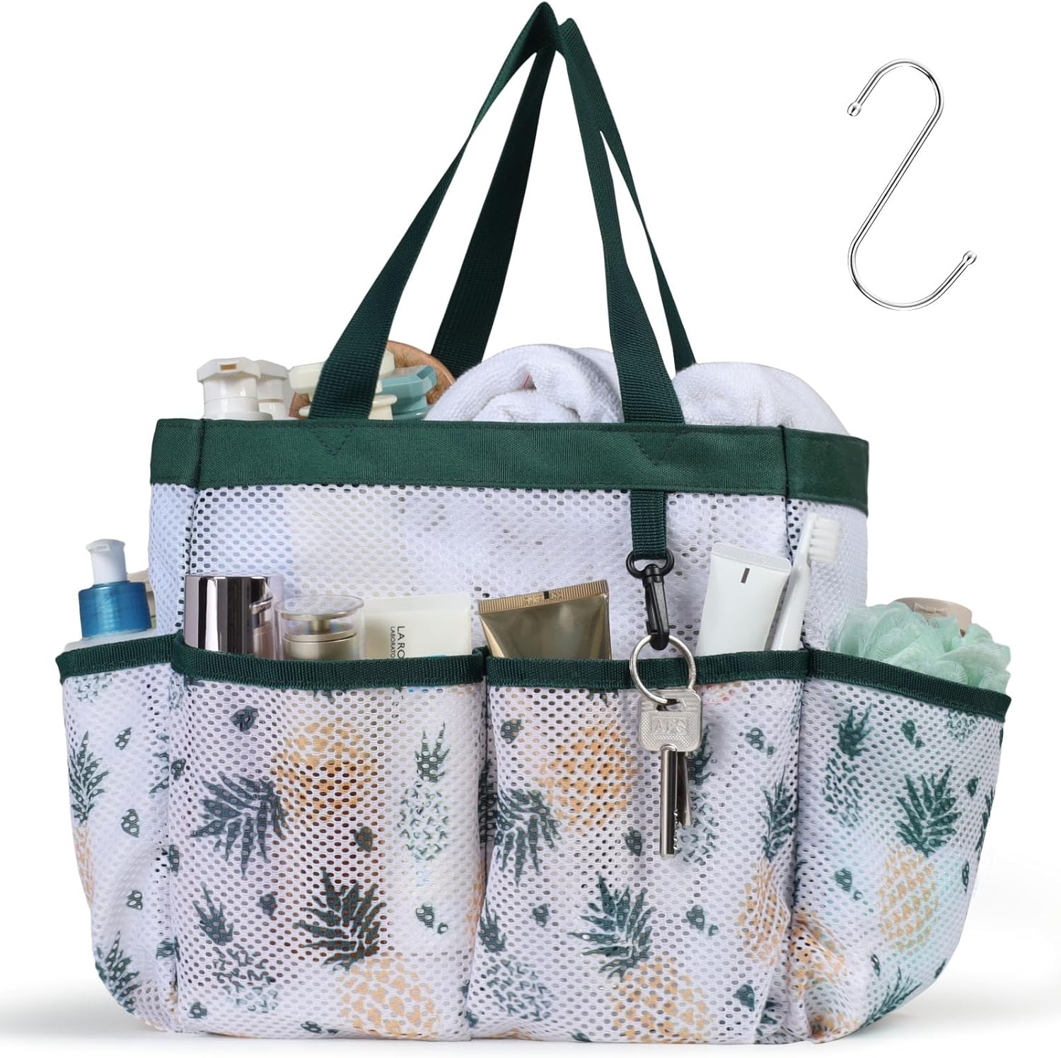 F-color Shower Caddy Portable - Mesh Shower Bag Basket Tote for College Dorm Room Essentials Bathroom Gym Camp Quick Dry for Women Men with S Hook, Green Pineapple