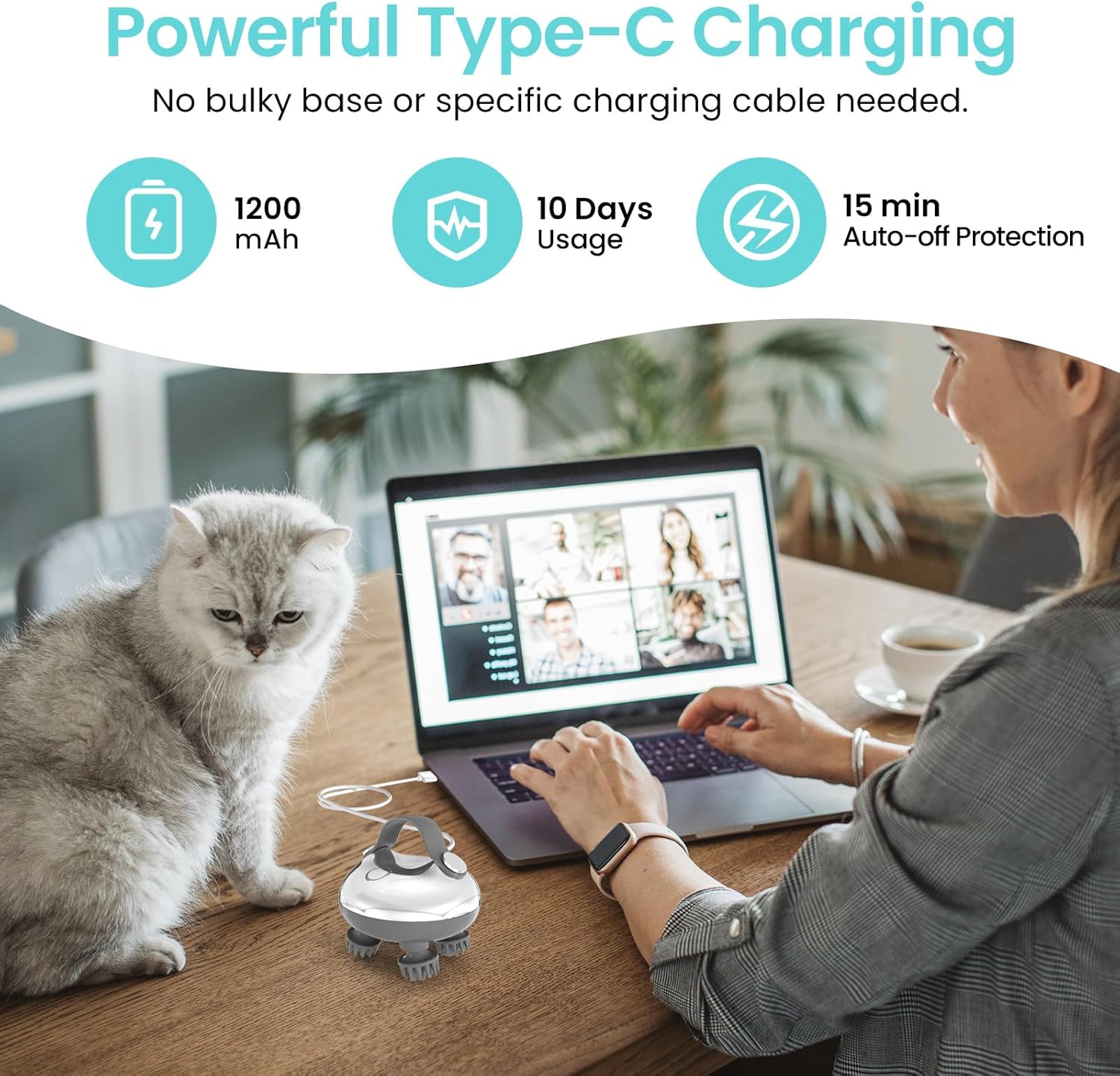 - 🔋【Long-Lasting Rechargeable Battery with Smart Auto-Off】Built with a 1200mAh lithium battery, this cordless scalp massager delivers up to 2–3 hours of use on a single charge—about 10 days of daily use. The 15-minute auto-off feature prevents over-massaging and saves power.