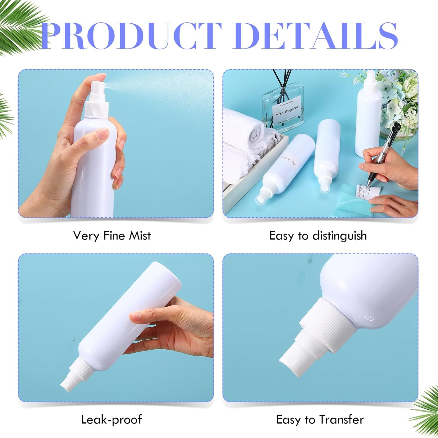 - Reasonable Design: there is a spray cap of fine mist bottle, you can tighten it to prevent the water from leaking, and the cover of the spray head can also help with stopping the water dropping, and thus you do not need to worry about getting your bags wet when you carry them out
