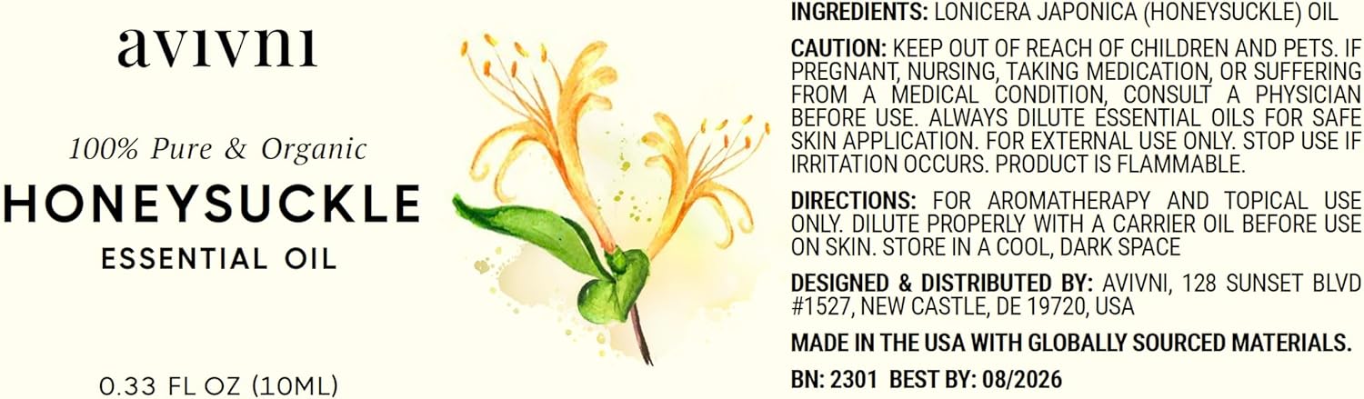 Avivni Honeysuckle Essential Oil - 100% Pure & Natural, Undiluted for Aromatherapy, Hair, Diffuser (0.33oz - 10ml)