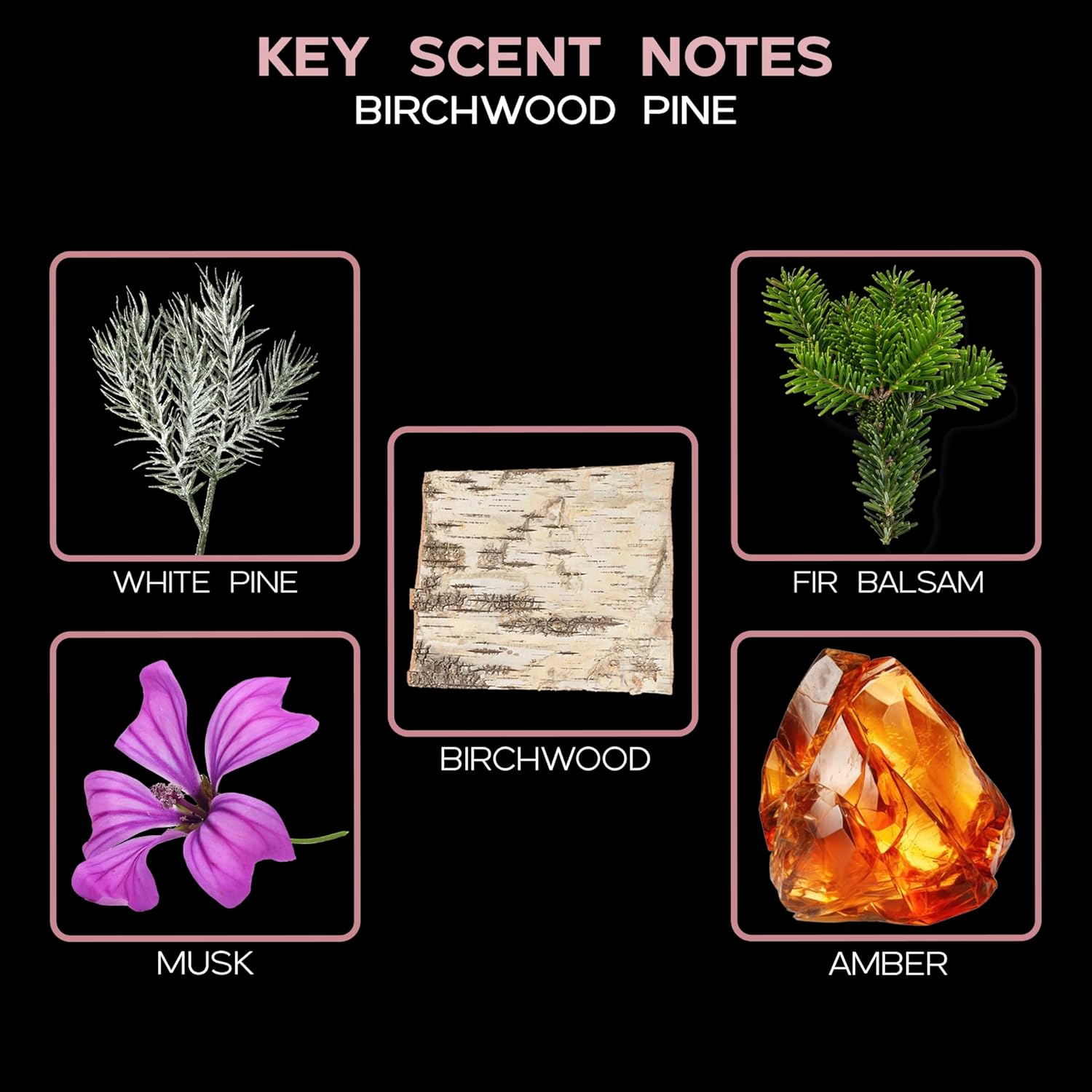 - BIRCHWOOD PINE – is a crisp, woodsy fragrance of White Pine, Balsam Fir, and Birch Wood; presented in our Modern Striped Diffuser, a sleek frosted glass bottle etched with clean vertical stripes for a minimalist yet eye-catching look, topped with a slender neck and delicate forest green ribbon accent for a refined, timeless look, and filled with rustic pine branches; ideal for lodge-style, pine, and warm wood-toned décor