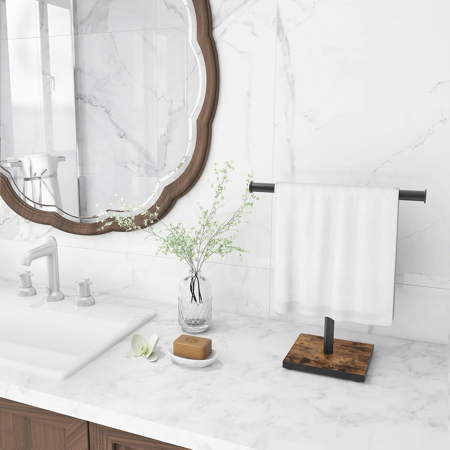 Hand Towel Holder Stand, Bathroom Hand Towel Rack with Weighted Base, T-Shape Standing Towel Racks, Farmhouse Countertop Towel Stand for Kitchen Counter, Rustic Black Brown