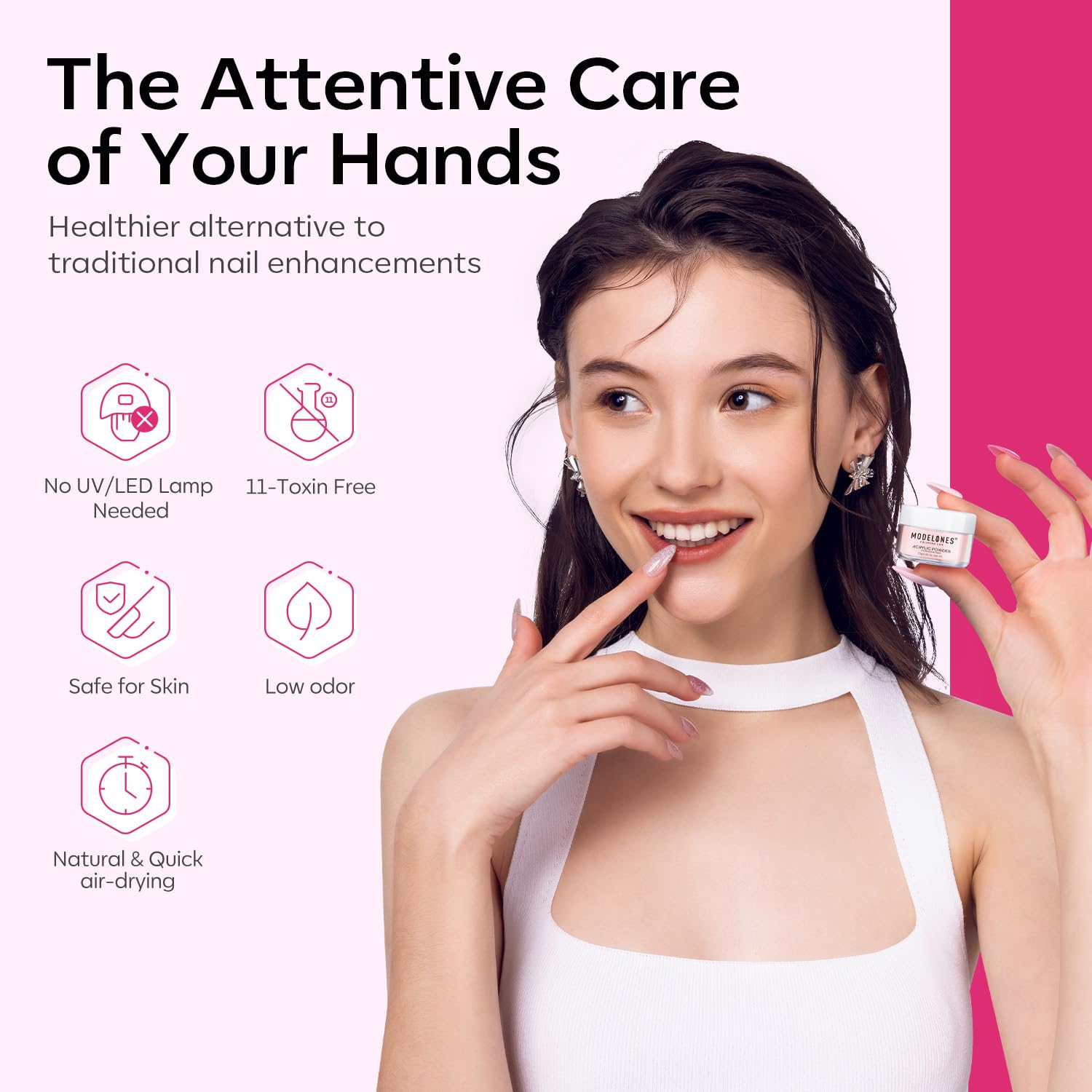 - SAFE & HEALTHY: Modelones acrylic powder features healthy and 11 toxin-free ingredients. No harsh ingredients or adhesives that lead to damaged nails, paraben & cruelty-free, anti-chipping, low odor and skin-friendly.