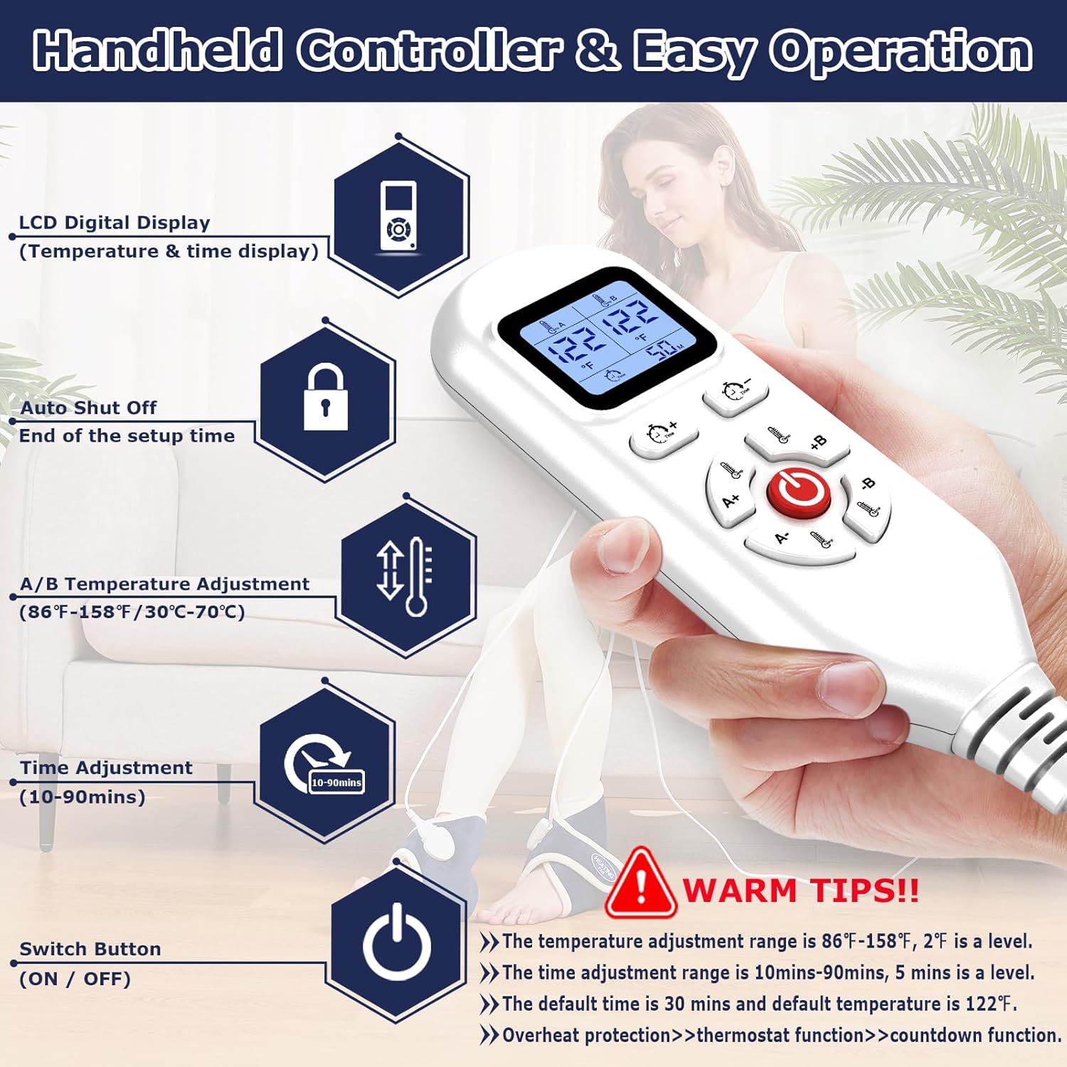 - 【AUTO SHUT-OFF & Use with Confidence】A new integrated heating technology, uniform heat conduction, fast heating in seconds and maintain a constant temperature. Heated ankle braces feature 86℉-158℉ temperature setting and 10-90min timer setting. AUTO SHUT-OFF at a pre-set time, keeping you safe even if you drift off to sleep. CAMECO heated ankle wraps features an overheat protection, countdown, thermostat protection to provide permeating soothing heat and maintaining a preset temperature.