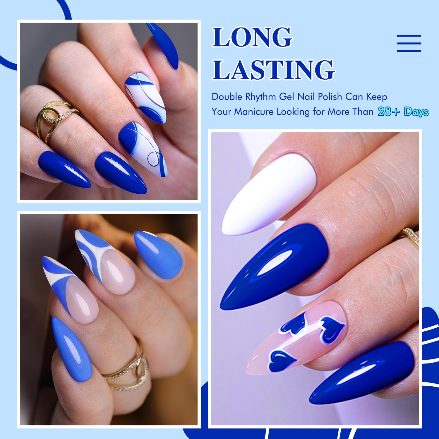 - Blue Gel Polish Set: Double Rhythm blue gel polish kit includes 6colors 7.5ml / 0.26 fl.oz gel polish. This blue gel polish set includes light blue,sky blue,royal blue,navy blue ,pure white and gold glitter 6 colors. They can be combined with each other arbitrarily, so you can creat your own nail art style.