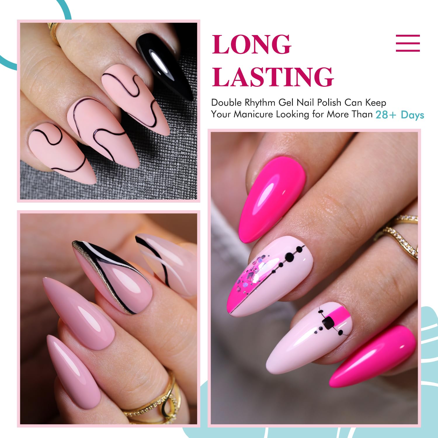 - Pink Gel Polish Set: Double Rhythm pink gel polish kit includes 6colors 7.5ml / 0.26 fl.oz gel polish. This pink gel polish set includes light pink,milky pink ,baby pink ,pink glitter ,nude pink and neon pink 6 colors. They can be combined with each other arbitrarily, so you can creat your own nail art sthle.