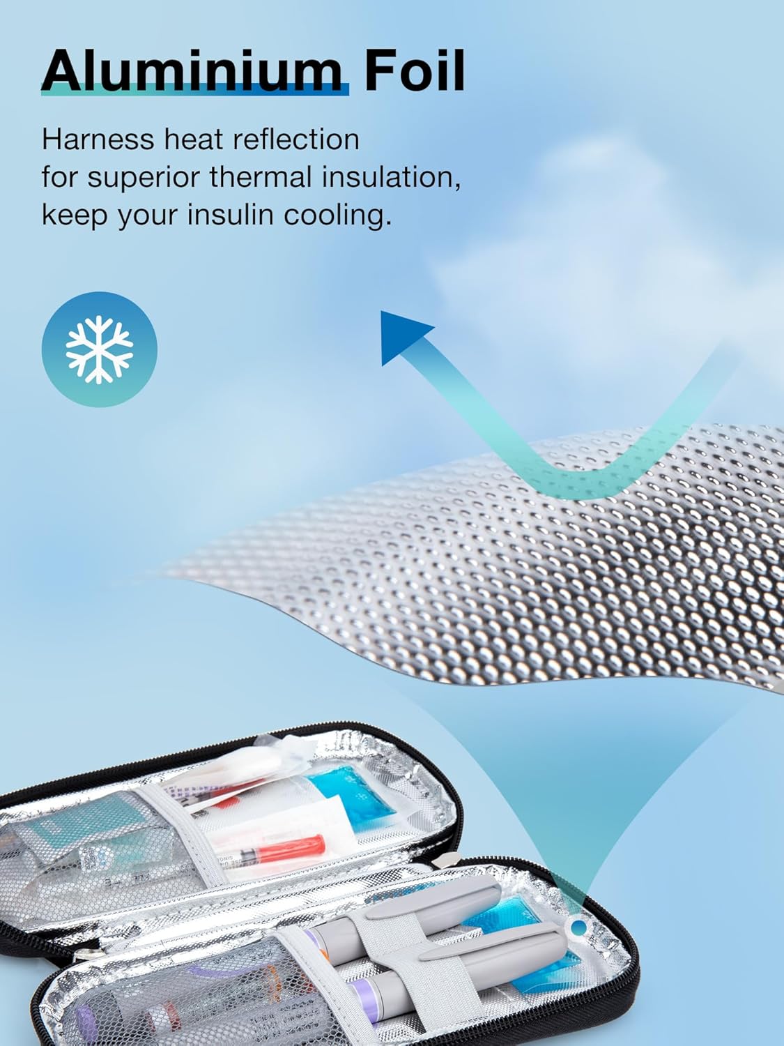 - Better Thermal Control – Crafted with high-quality aluminum foil insulation, this Travel Insulin Cooler Case (TSA Approved) maintains a stable temperature for hours. Whether you’re on a plane or running errands, the insulated insulin pen cooler travel case guards against heat and cold, ensuring your medication stays effective.