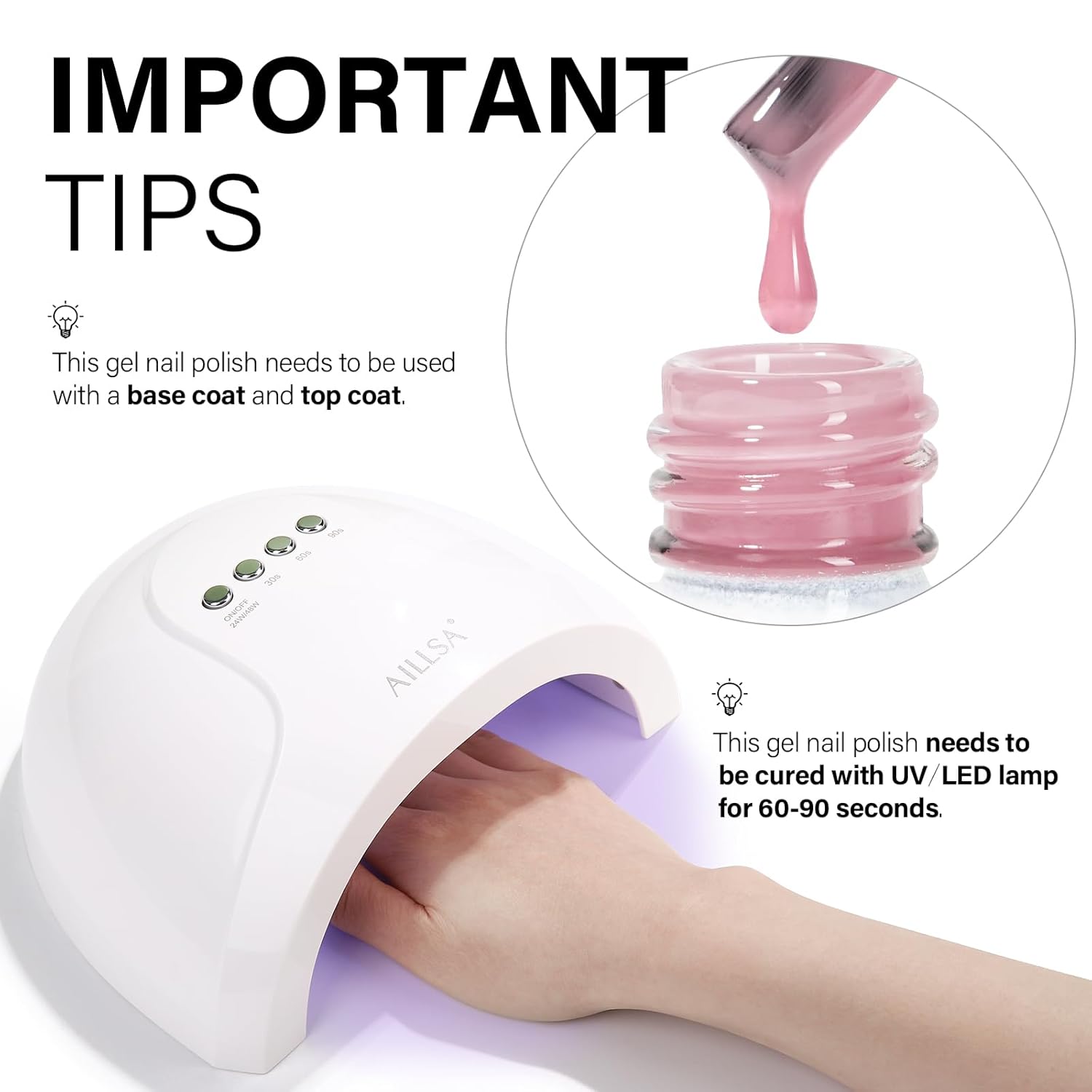 - LONG-LASTING SHINE - AILLSA jelly gel nail polish needs to be cured under L E D/U V light, under the correct use steps, it can last for 21-28 days and keep the shiny luster. You'll never have to worry about your nails peeling off while showering and doing housework. Let AILLSA serve you a longer time!