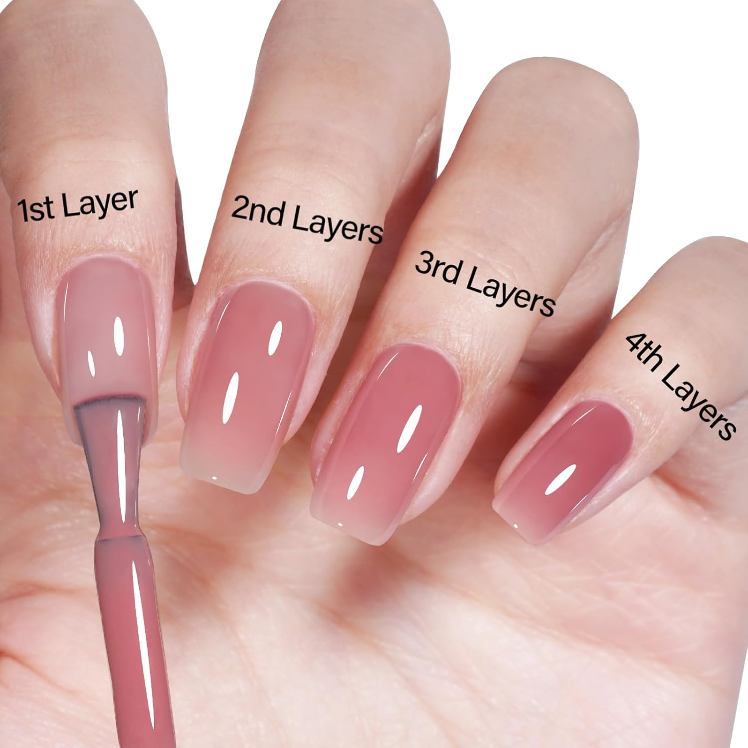 - EACH LAYER IS DIFFERENT EFFECT - This is a pink jelly gel polish.A quick and light application will make the color more even. Most importantly, its color depth depends on your nail base color and the number of layers you apply, the fewer layers the more sheer and the more layers the more vibrant.