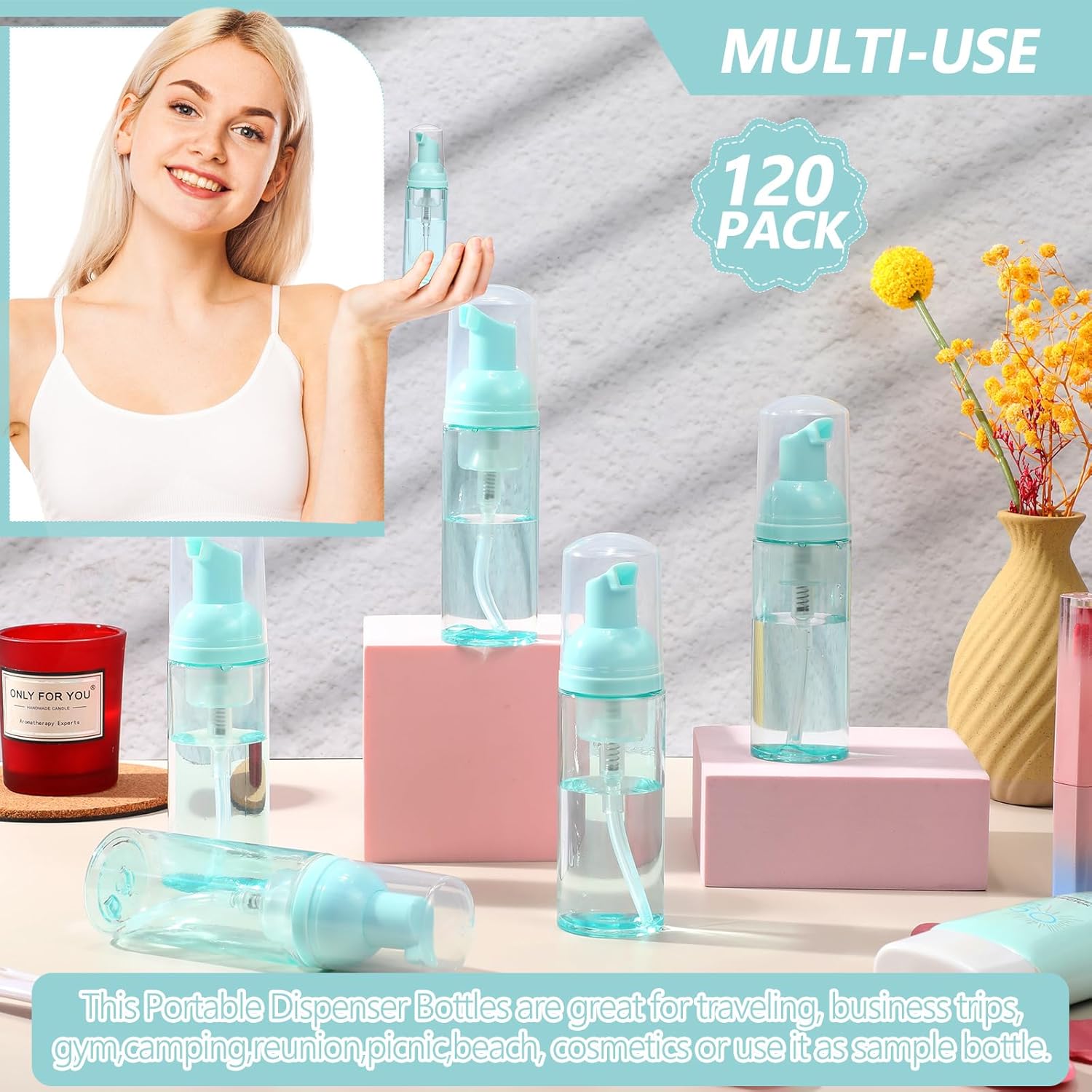 - 120 Pcs Mini Mousse Bottles: our foam pump bottle set includes 120 pieces of 60ml (2oz) plastic foam soap bottles, which are transparent green bottles with green pump heads; Each bottle has a clear cap on the top to prevent the contents from overflowing while carrying; The foaming dispenser bottles can be easily foamed, small, lightweight, and portable, the quantity is enough for your daily use and sharing