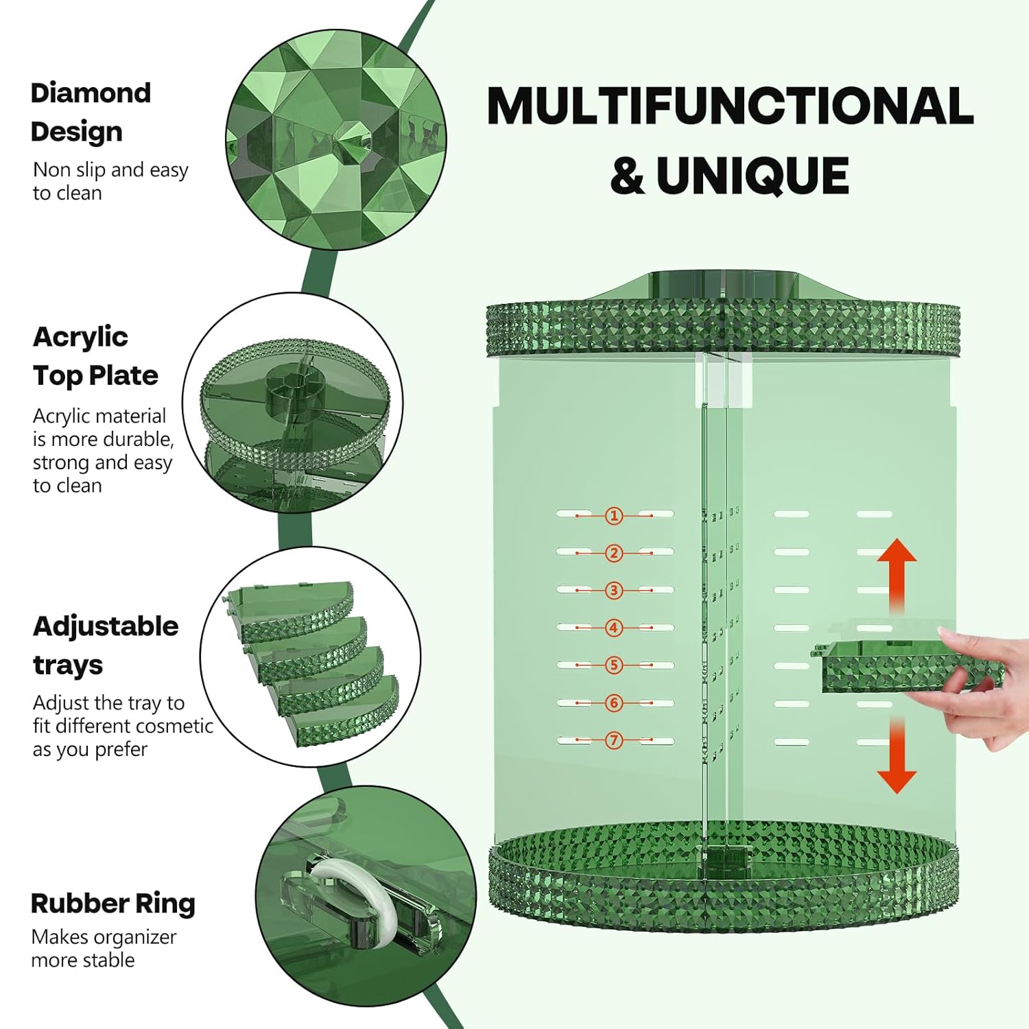 - 🎁【 CONVENIENT DESIGN & NEW COLOR 】Hemtroy Rotating Makeup organizer follows fashion with a new color - emerald green! Our organizers wear a 360° noiseless rotating base that makes it easy to find makeup in seconds. Make your appointments less late and your desk less cluttered.