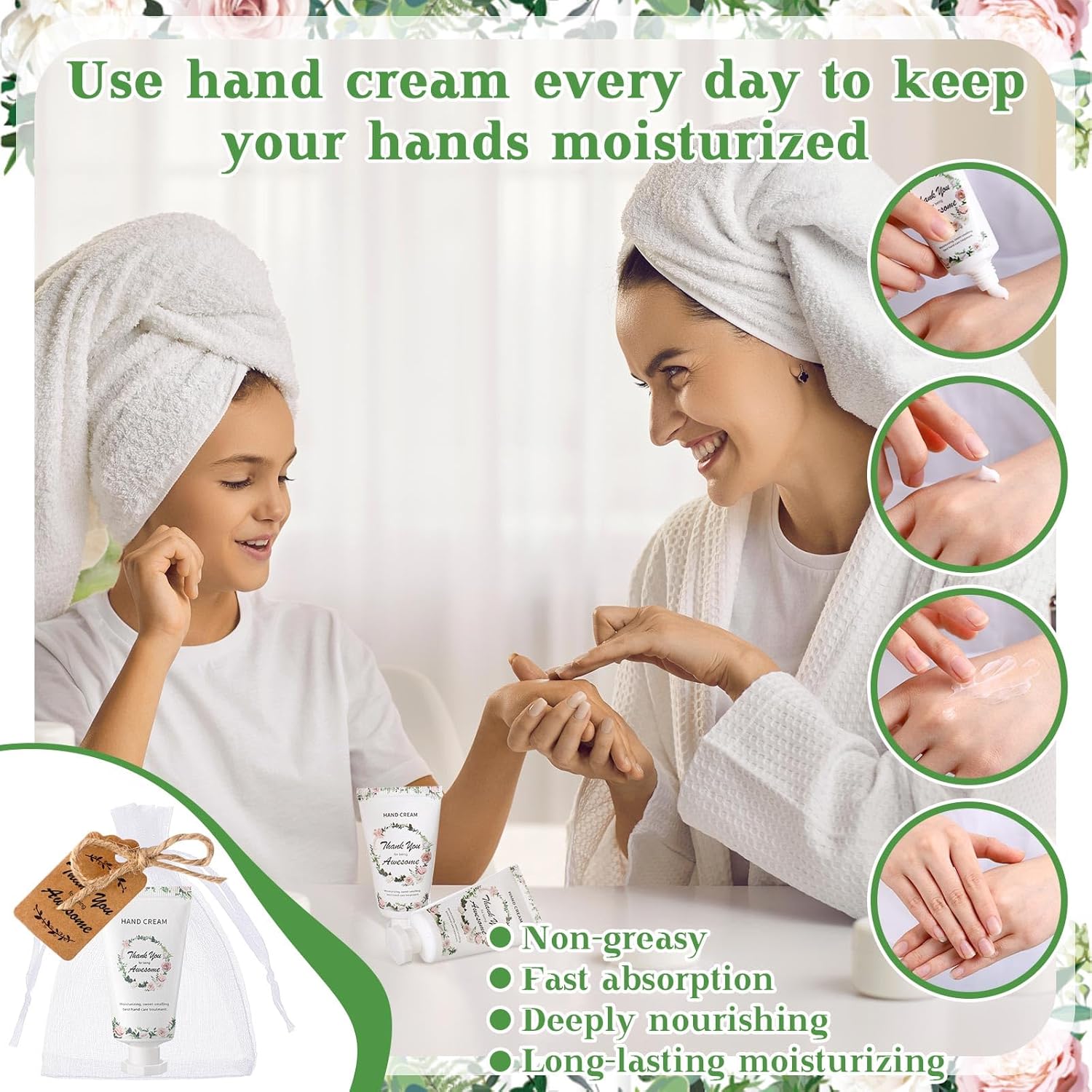 - Hand Cream Gift Set: this gift set is an ideal gift set for women; The scent of blossoms will make you feel comfortable and relaxed, enhance your spirit, and nourish your soul; The set includes 48 hand creams, 48 organza bags, and 48 cards, enough to share with your family and friend during weddings, Mother's Day, Christmas, and other holidays
