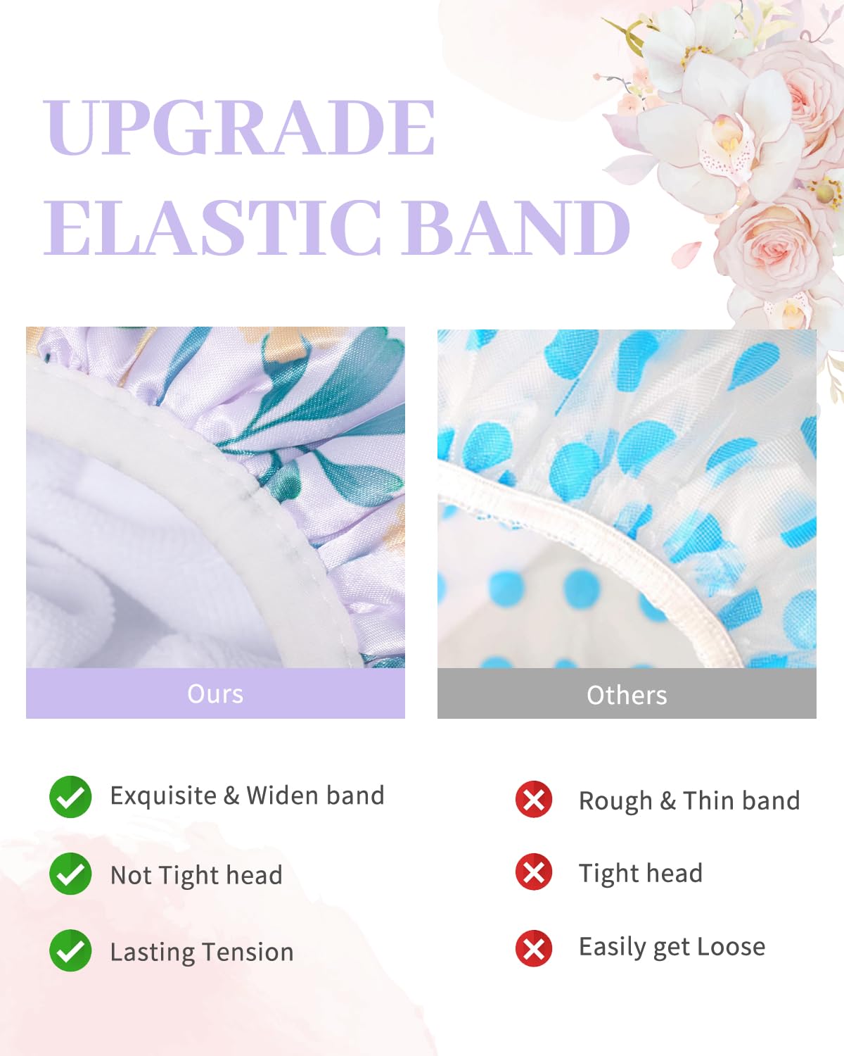 - 【TRIPLE-LAYER DESIGN】:Our waterproof shower caps are made with a soft satin fabric, waterproof EVA cloth, and terry cloth for extra absorption. Say goodbye to soggy hair!