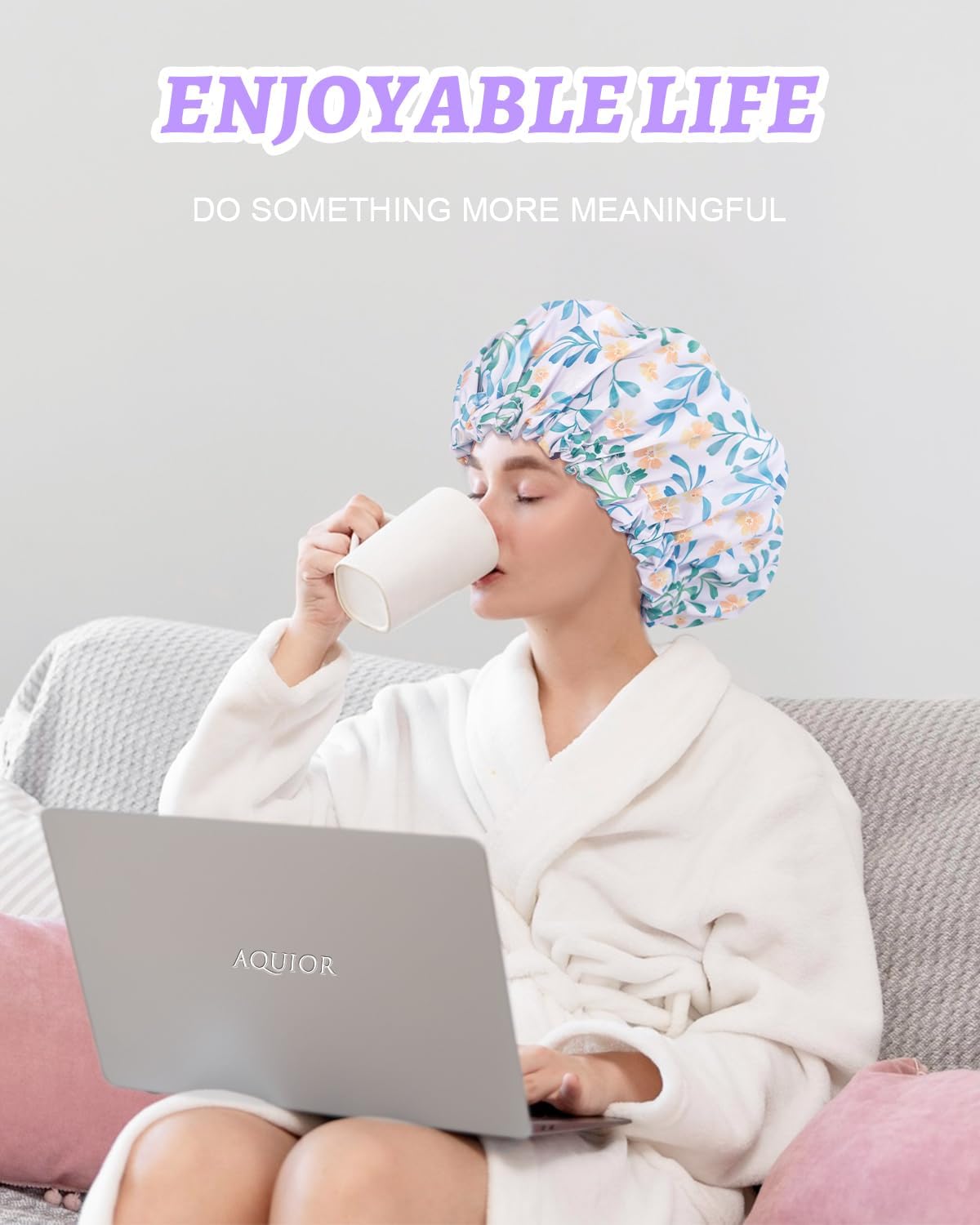 Aquior Shower Caps, Double Layer Waterproof Shower Cap for Women, Reusable Large Shower Cap for all Hair Lengths with EVA Lining, Soft Bath Shower Caps