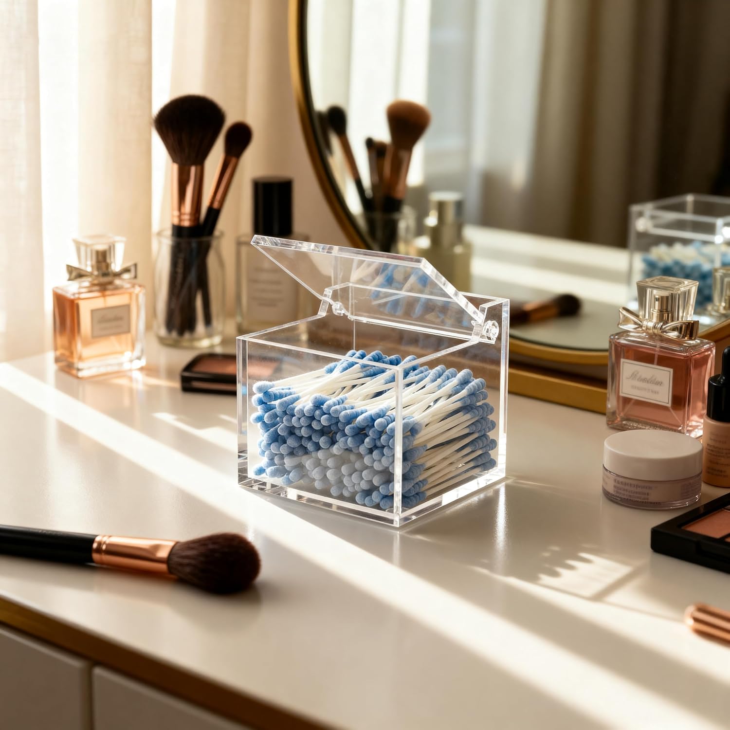 - Unique Design: This cotton square and qtip holder feature a dustproof lid to keep the items neat and clean. The crystal clear design makes it a stylish decor for your bedroom, bathroom, office, drawer, and dresser
