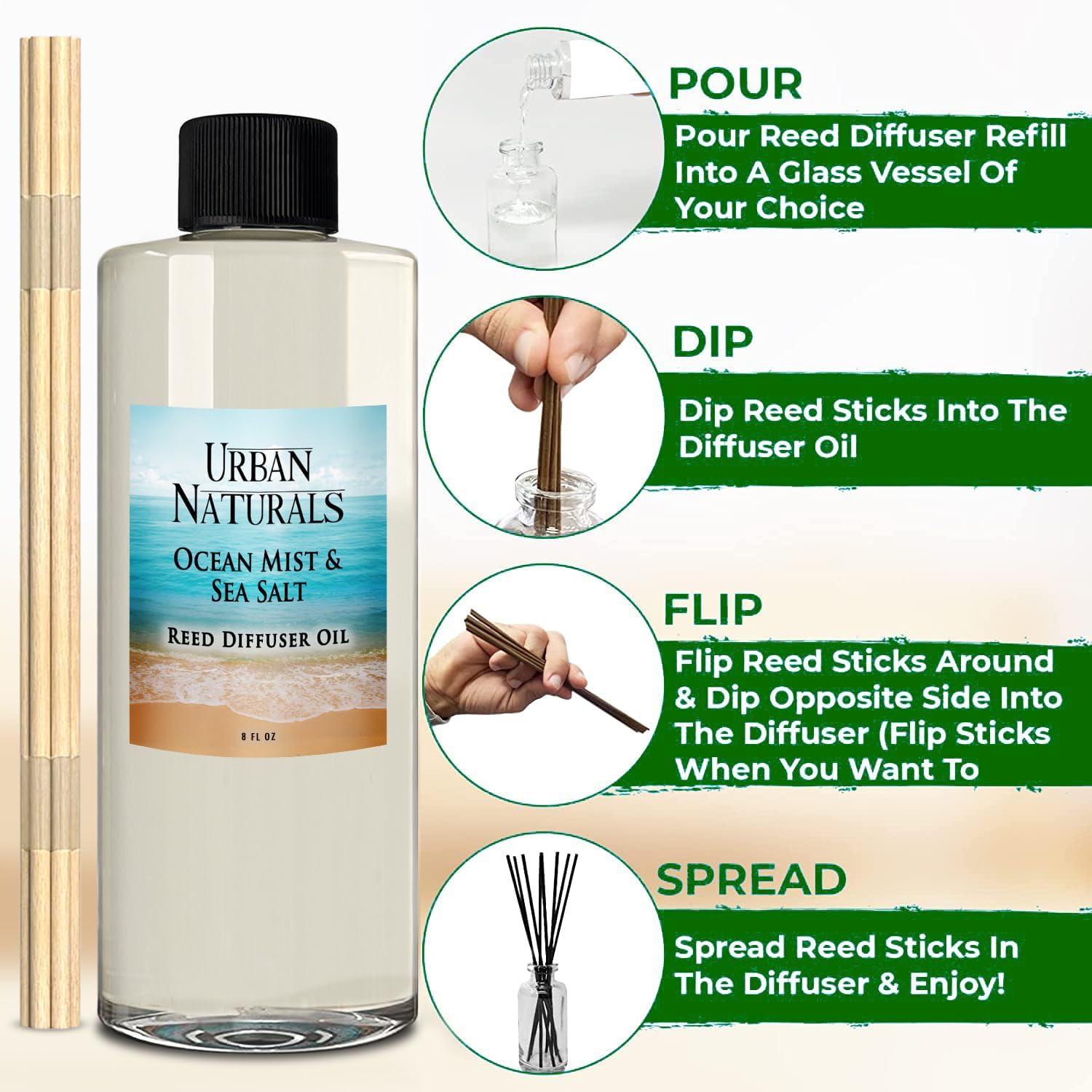 - 【OCEAN MIST & SEA SALT SCENT】Includes one 8 oz reed diffuser refill oil and a free set of natural replacement reed sticks. Salt spray, violet leaf, sea grass, driftwood, and aquatic musk combine for a breezy, ocean-fresh scent.