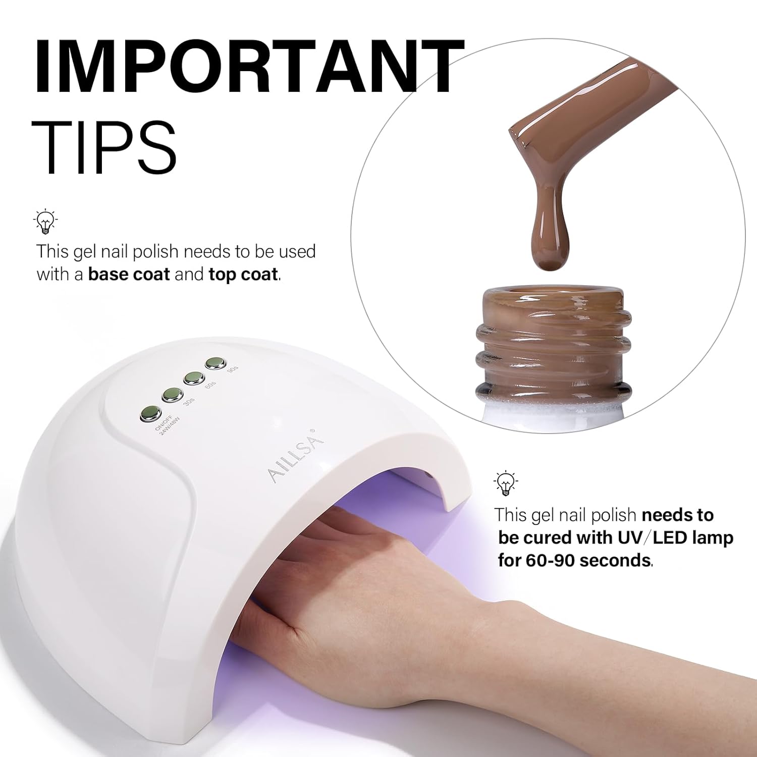 - 【 LONG-LASTING SHINE 】AILLSA coffee brown jelly gel nail polish needs to be cured under L E D/U V light, under the correct use steps, it can last for 21-28 days and keep the shiny luster. You'll never have to worry about your nails peeling off while showering and doing housework