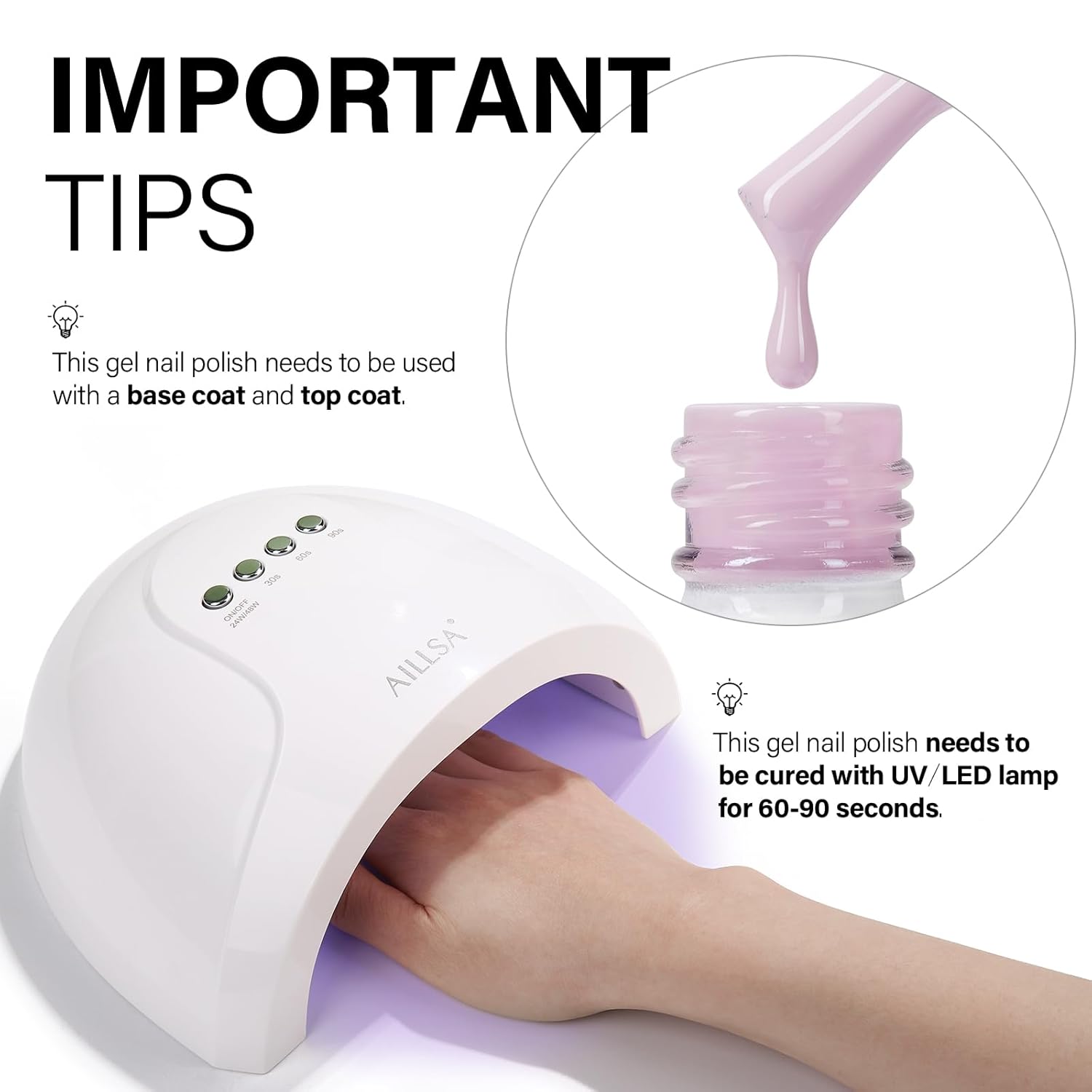 - ππππ-πππππππ πππππ : AILLSA neutral gel polish needs to be cured under L E D/U V light, under the correct use steps, it can last for 21-28 days and keep the shiny luster. You'll never have to worry about your nails peeling off while showering and doing housework. Let AILLSA serve you a longer time!