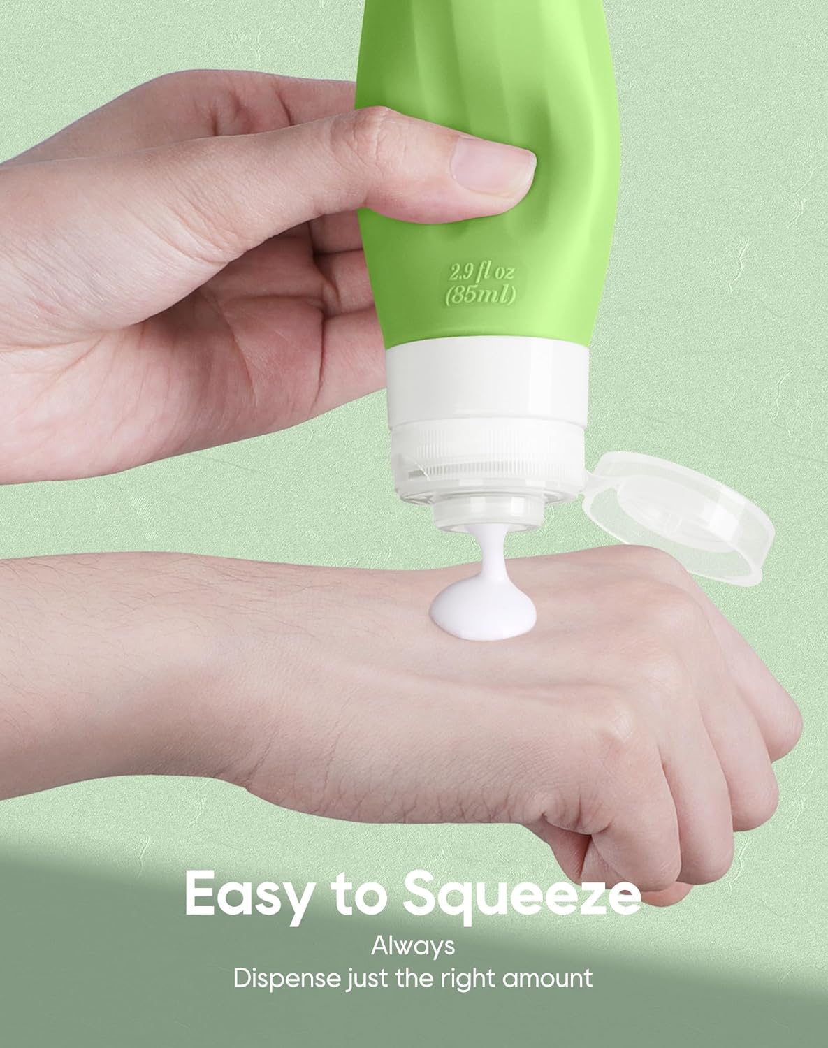 - SAFE SILICONE MATERIAL: Made of Food Grade BPA Free Silicone, this travel set is sturdy, soft, squeezable, flexible and reusable. Safe material guarantee that you can not only use them to store shampoo, conditioner, face soap, sunscreen, creams, lotion or etc, but also safe for food, various seasonings. Soft silicone body make you squeeze out contents easily