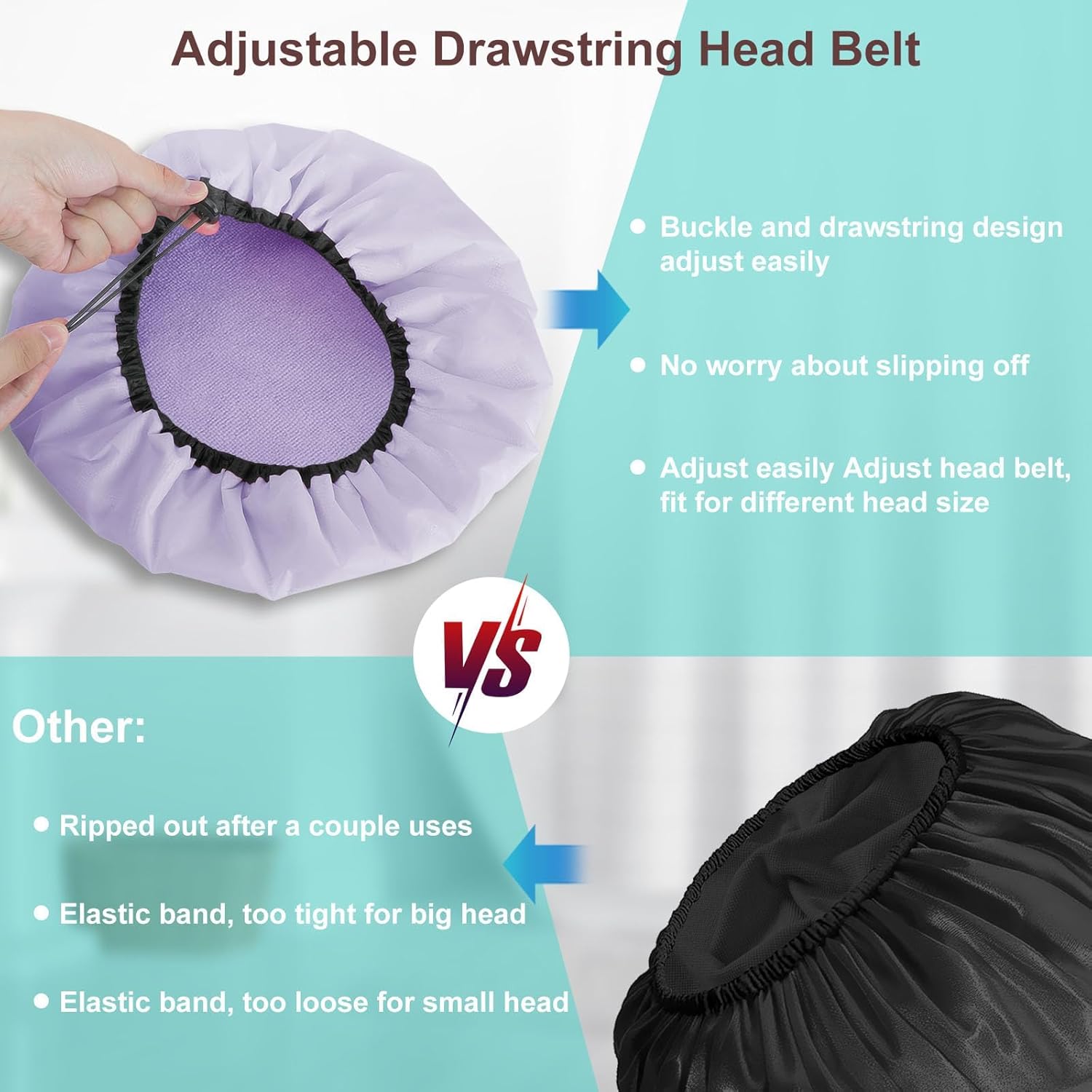 - [🛁Adjustable Shower Cap for Comfort]: Our adjustable shower cap for women features a drawstring design, allowing you to easily adjust the cap size for a better fit. Unlike shower cap with elastic band that is too tight and leave marks on your forehead, our adjustable drawstring provides a comfortable and personalized fit for various head sizes. It does not squeeze or strain your head, ensuring a pleasant and relaxing experience.