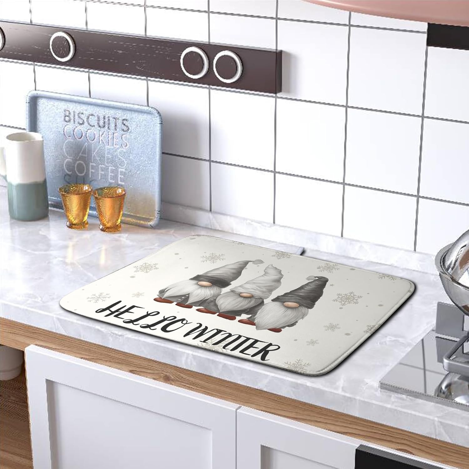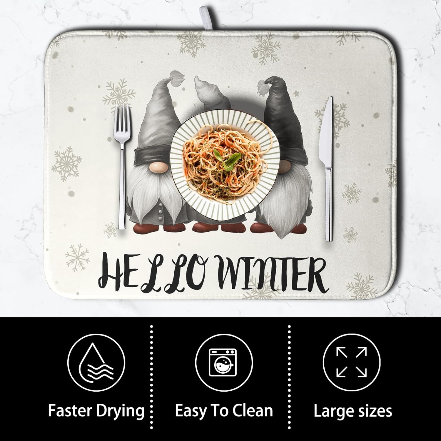 - ⛄【High quality raw materials】 High quality polyester gnome drying mats. Made of microfiber, ultra absorbent and fast drying mat. This winter kitchen drying mat for dishes is made of double-layer sponge, absorbent microfiber, in a 3-ply design provides a soft touch.
