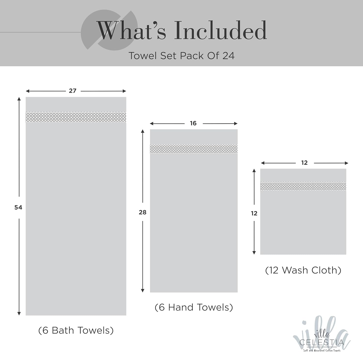 - VILLA CELESTIA LUXURIOUS TOWEL SET (PACK OF 24): Uplift your mood and bathing experience with the super soft and luxurious touch of our Villa Celestia Bath Towels Set. Bundled in a 24 pack design, our towel sets for bathroom consists of 6 Bath Towels (27β X 54β), 6 Hand Towels (16β X 28β), and 12 Washcloths (12β X 12β), giving you the complete package of comfort, indulgence, and delight.