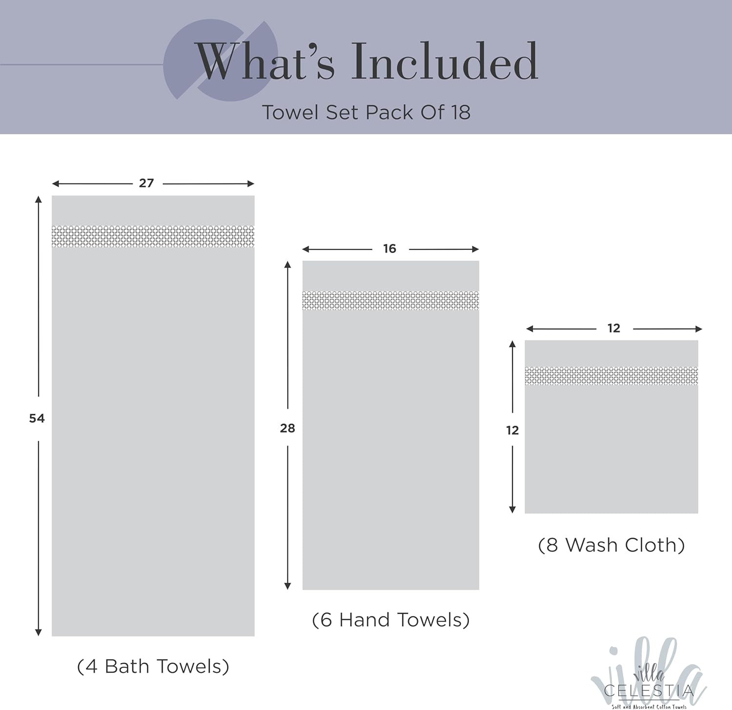 - VILLA CELESTIA LUXURIOUS TOWEL SET (PACK OF 18): Uplift your mood and bathing experience with the super soft and luxurious touch of our Villa Celestia Bath Towels Set. Bundled in a 18 pack design, our towel sets for bathroom consists of 4 Bath Towels (27β X 54β), 6 Hand Towels (16β X 28β), and 8 Washcloths (12β X 12β), giving you the complete package of comfort, indulgence, and delight.