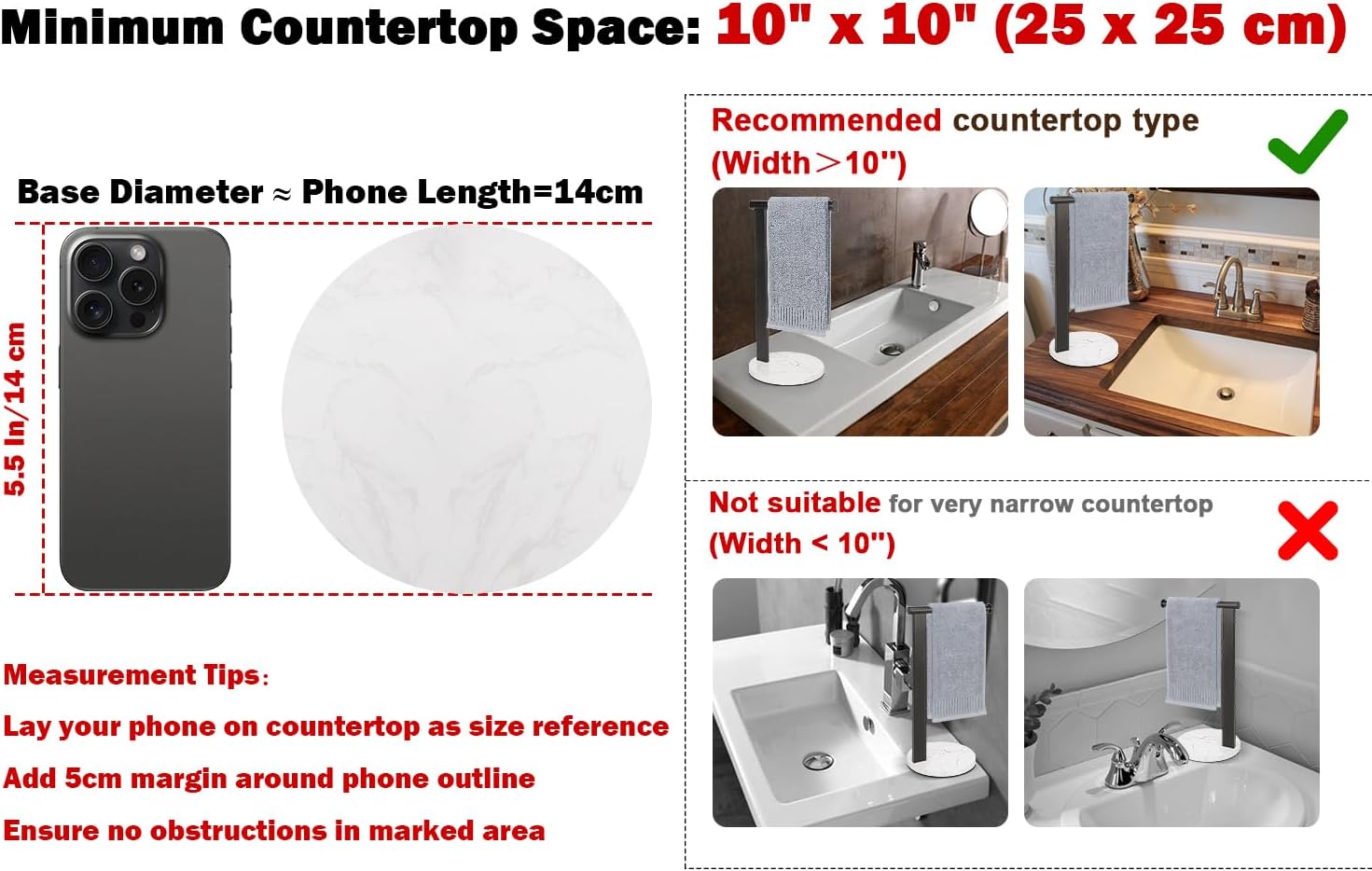 - EASY INSTALLATION: Hand towel holder Height is 14.48 inch, Base Width is 6.3 inch, no drilling required, just screw in; Note: Requires a minimum countertop space of 10" x 10" (25 x 25 cm) and a depth of at least 7", please consider carefully before purchasing