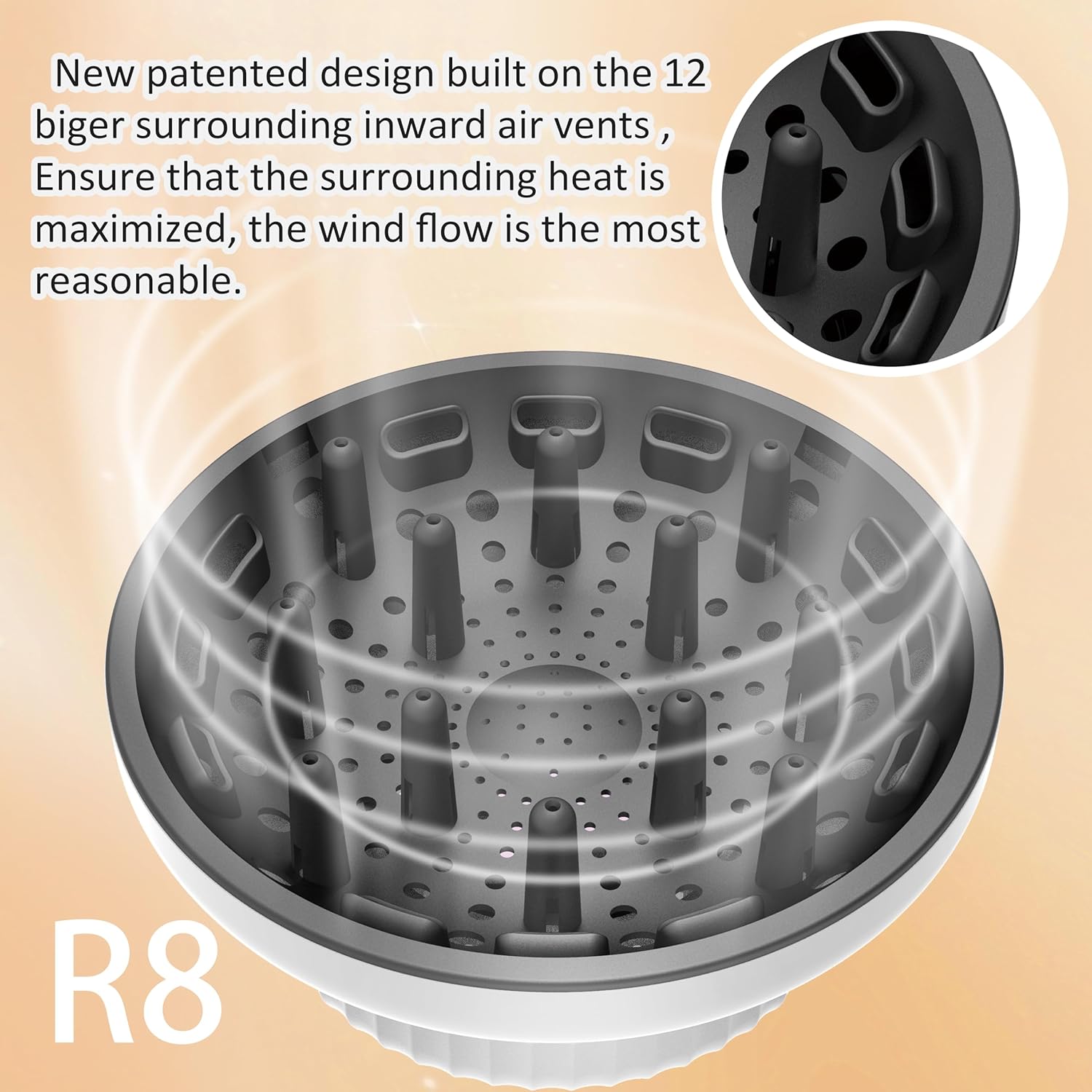 - New patented design built on the 12 biger surrounding inward air vents are designed,Ensure that the surrounding heat is maximized, the wind flow is the most reasonable, and the faster drying.even when thick, long and frizzy hair as well.
