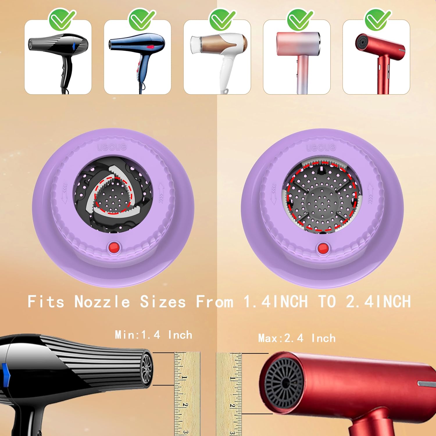 - The Ligolig Diffuser hair dryer is thoughtfully designed with lock button, can be adjusted and fit 99% hair dryers on the market for hair dryer with nozzle diameter of 1.4 inch - 2.4 inch. This hair diffuser compatibilityamplify the natural beauty of your curls, giving them definition and bounce. Whether you have wavy, curly, or coiled hair, our diffuser attachment for hair dryer are the ultimate tool to achieve your desired look.