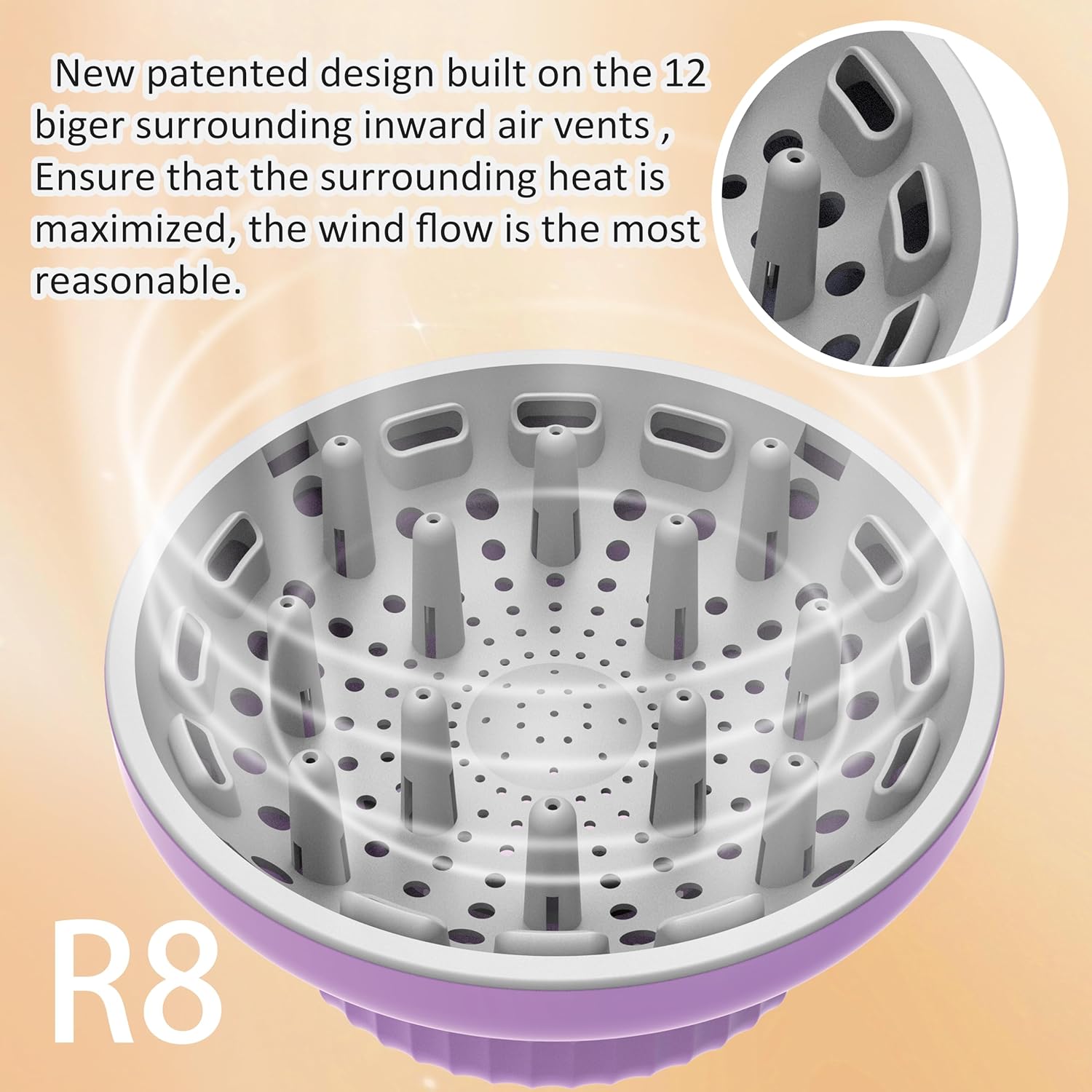 - New patented design built on the 12 biger surrounding inward air vents are designed,Ensure that the surrounding heat is maximized, the wind flow is the most reasonable, and the faster drying.even when thick, long and frizzy hair as well.