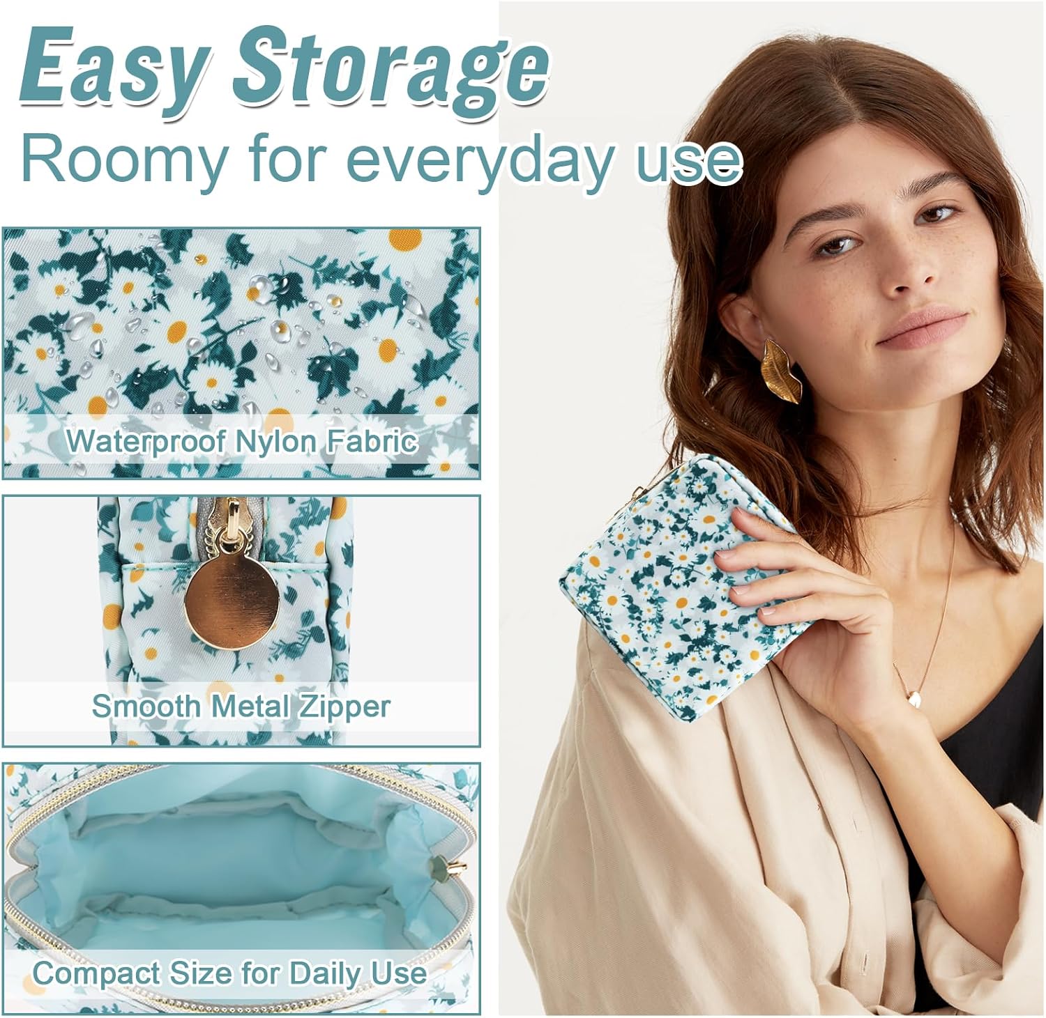 - ❤【Multiple Sizes & Colors】Large, Small, Mini, or Slim, we have it all! Cosmetic bags are available in many colors: Blue-Daisy, Green-Daisy, White-Flower, Pink-Flower and other colors for you to choose. Nylon makeup bag for purse can be used for travel, outdoors and organization, it can be used as a purse bag, travel pouch, clutch, makeup organizer and more.