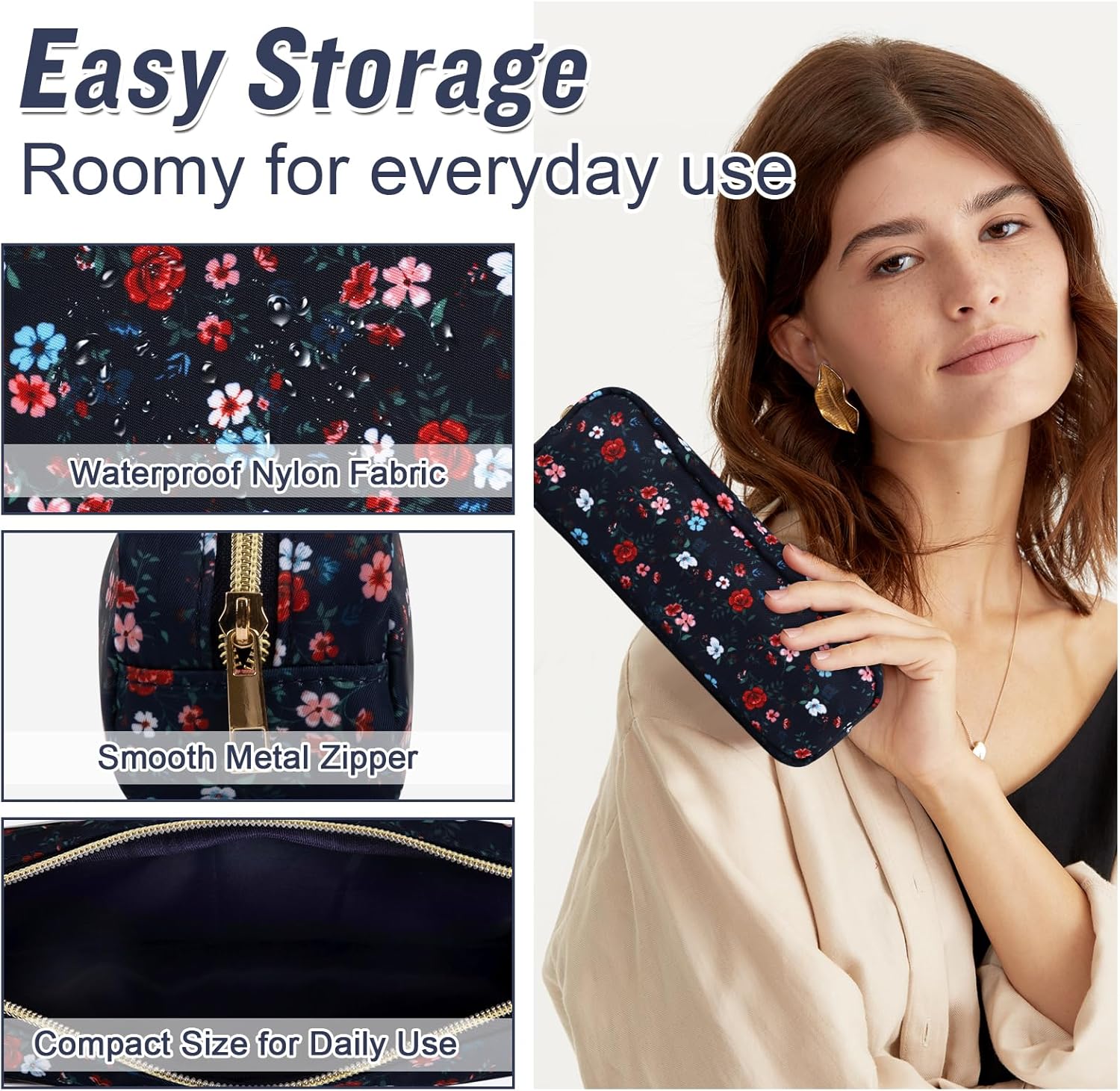 - ❤【Multiple Sizes & Colors】Large, Small, Mini, or Slim, we have it all! Cosmetic bags are available in many colors: Blue-Daisy, Green-Daisy, White-Flower, Pink-Flower and other colors for you to choose. Nylon makeup bag for purse can be used for travel, outdoors and organization, it can be used as a purse bag, travel pouch, clutch, makeup organizer and more.
