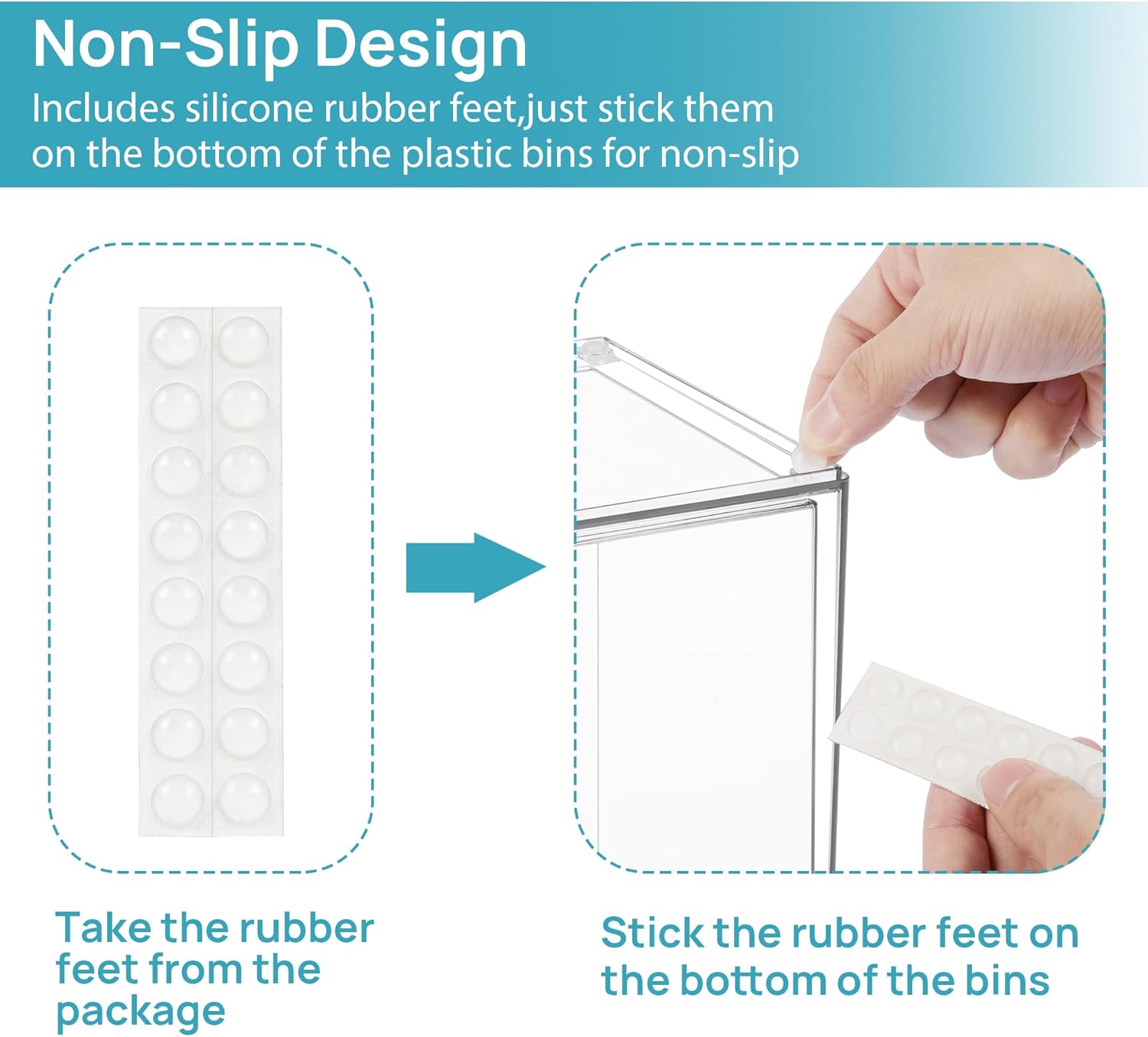 - [Built-in Handle and Non-Slip] Clear organizing containers are designed with pull-out handles, it is convenient to store and take out items.Extra silicone pads are included, add the rubber sticker dots to the bottom,our storage drawers slides in and out very effortlessly and outer frame don't move when pulled out the drawers.