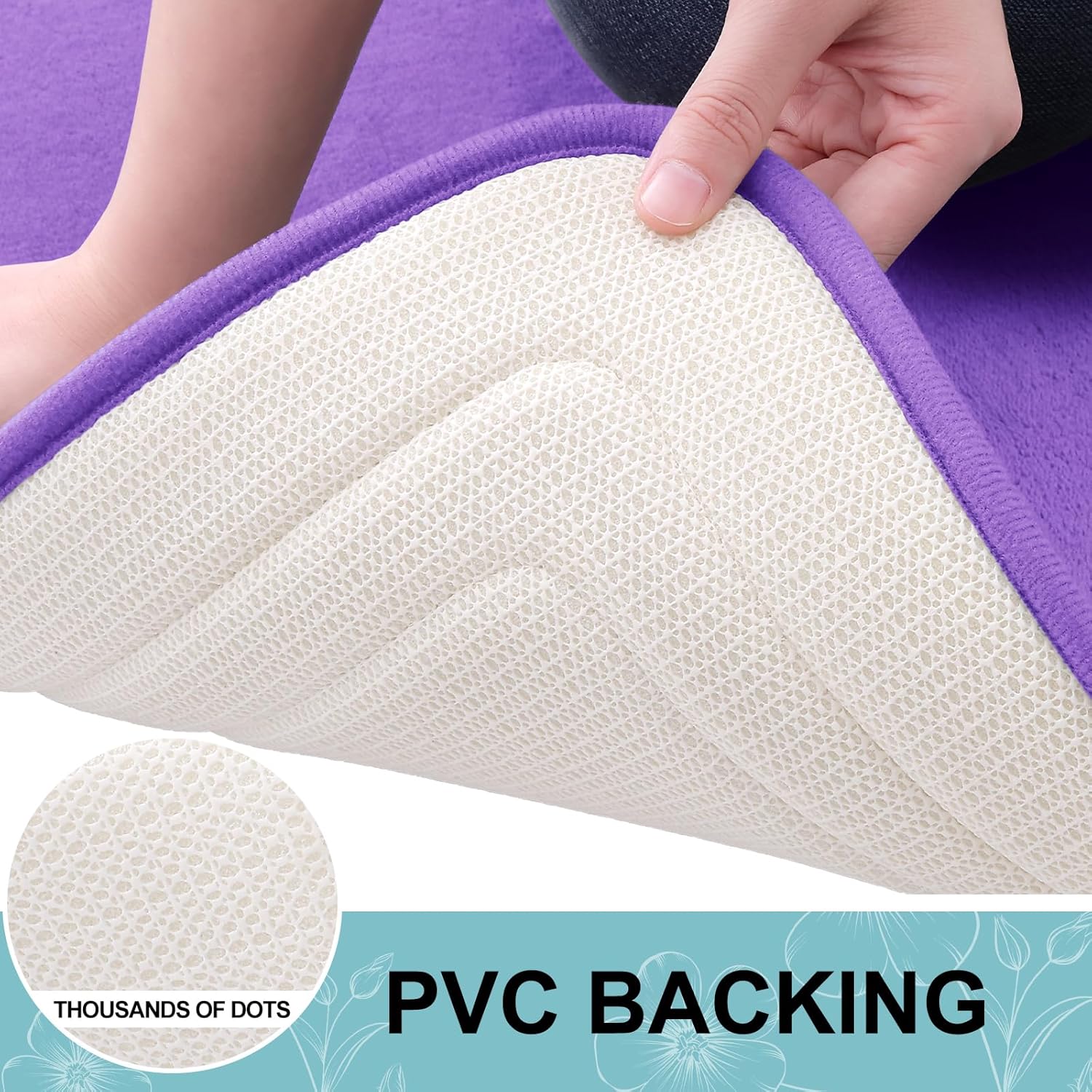 - [STABLE FOOTING] Our bathroom mat is equipped with a robust and enduring PVC backing, preventing shifting and skidding. Unlike mats with rubber backing that may wear off after washing, our bath mat ensures lasting durability. For a secure footing, keep the floor beneath the rug dry and avoid placing it on wet surfaces.