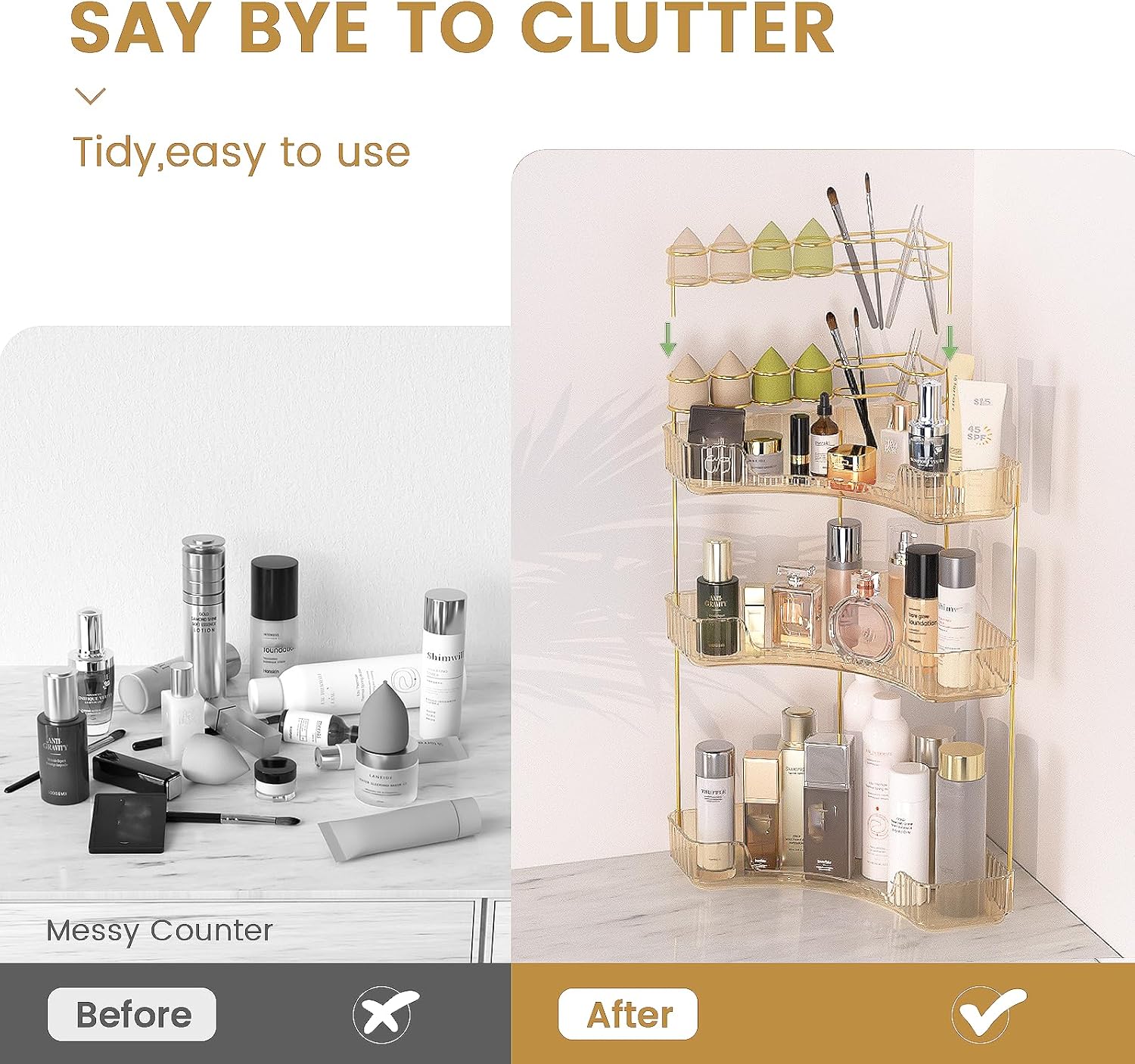 - ăCorner Makeup OrganizerăSay goodbye to your cluttered countertop, our countertop organizer fully utilizes corner space, adding 100% extra storage space and keeping a tidy and organized bathroom counter