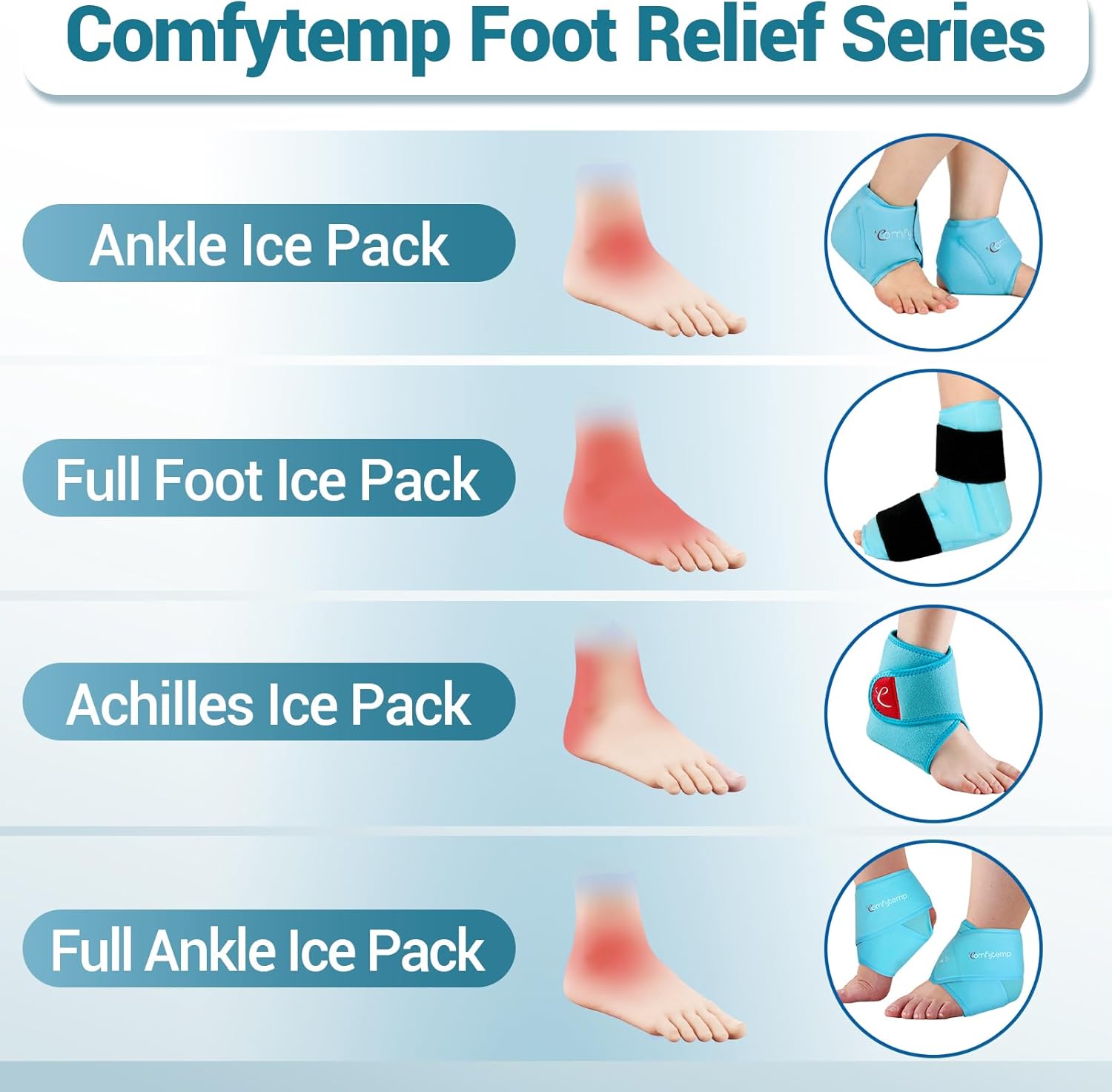 - Upgraded One-Piece Design: Comfytemp's new version of ankle ice pack features an upgraded all-in-one design to make it convenient for you to use without additional accessories or parts. All it takes is 2 included wide velcro strips to make the ice pack hug your ankles tightly with extra compression and provide a deeper, more intense cooling experience. Regardless of whether your feet are large or small, our ice packs are suitable for all sizes and perfectly adapts to the curves of your feet.