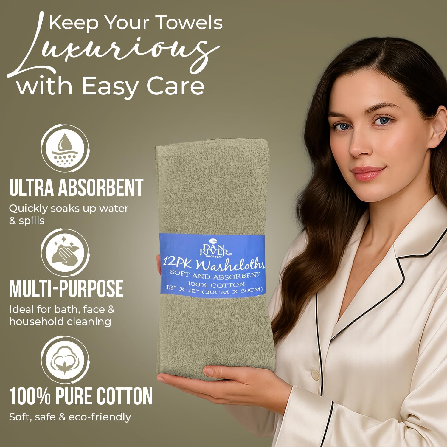 DAN RIVER 100% Cotton Wash Cloths 12 Pack [12x12] Soft & Absorbent Terry Cloth washcloths, Gym, Hotels & Spa Perfect for Everyday Use Fingertip Towels, Beige