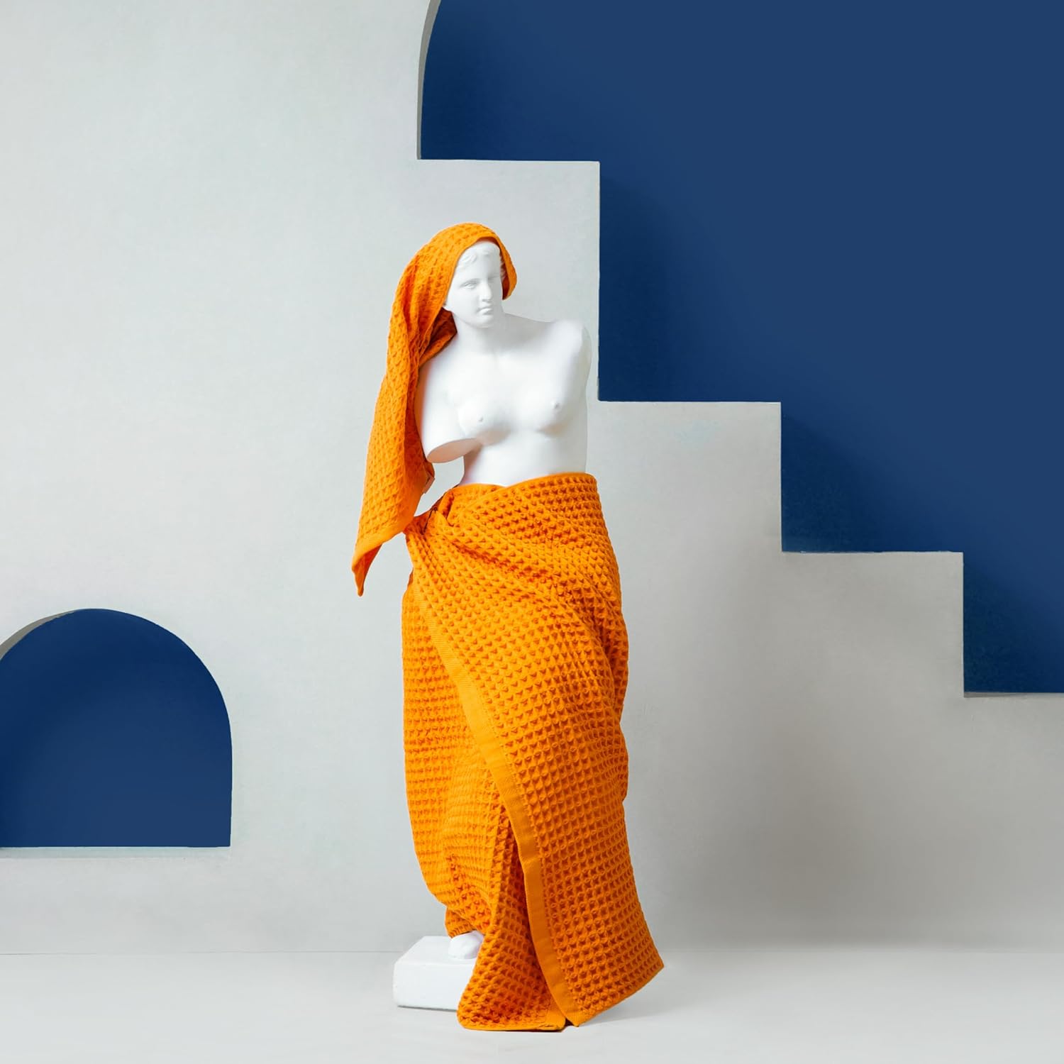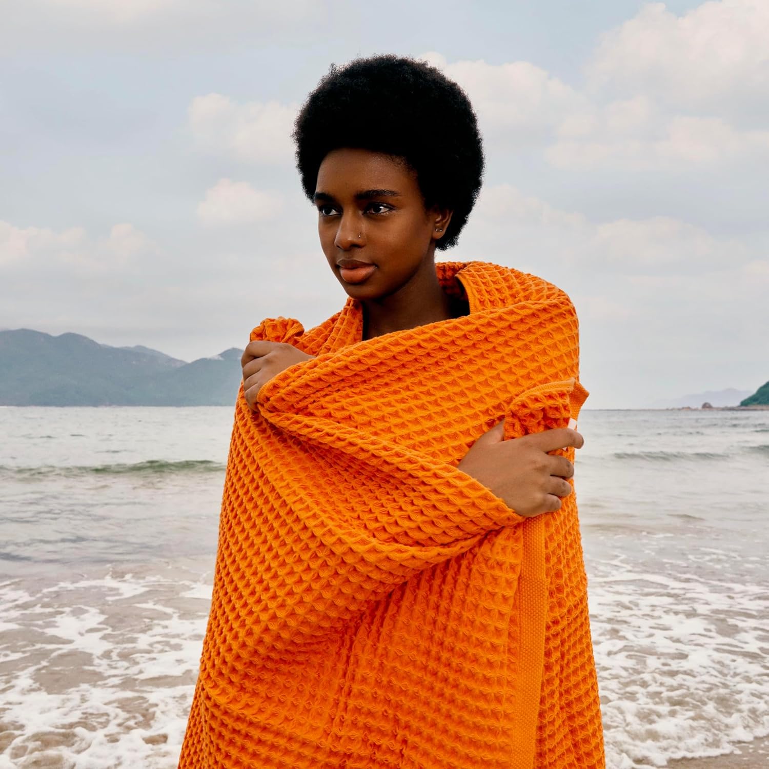 Luxury Japanese Cotton Waffle Bath Towel | Plush, Absorbent, and Quick Dry | Free Storage Bag Included (Coral Orange, Bath Sheet (2 Pack))