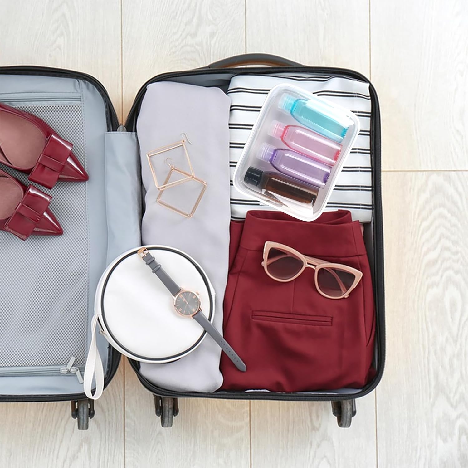 - Travel Essentials: This travel containers for toiletries set includes 4 empty bottles with flap cap(3 of 4 marked with "Shampoo", "Conditioner", and "Body Soap" for easy identification) and a clear travel bag to hold them all; The clear plastic travel bottles for toiletries allow you to easily see what's inside, and the bag provides a convenient way to store and transport them.