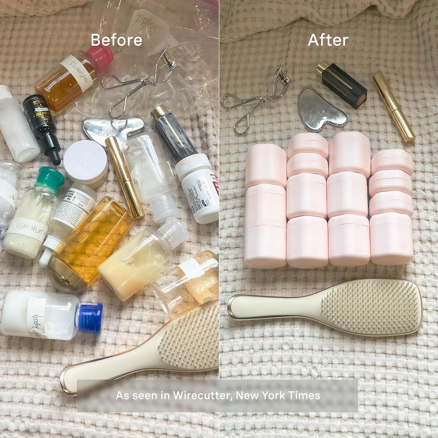 Cadence Travel Containers Basic Skincare Set - Magnetic Containers with Lids,Carry On Travel Essentials For Women/Men - 3 Small Capsules (0.56oz) - Cleanser, Moisturizer & Sun-Icon Labels - Petal
