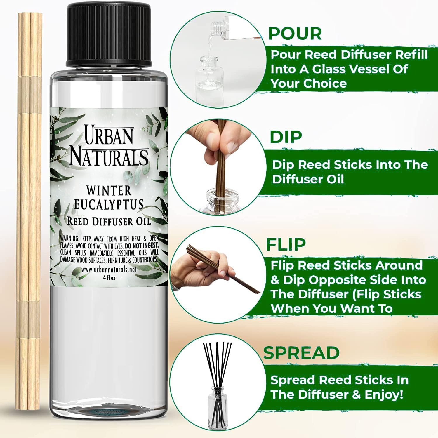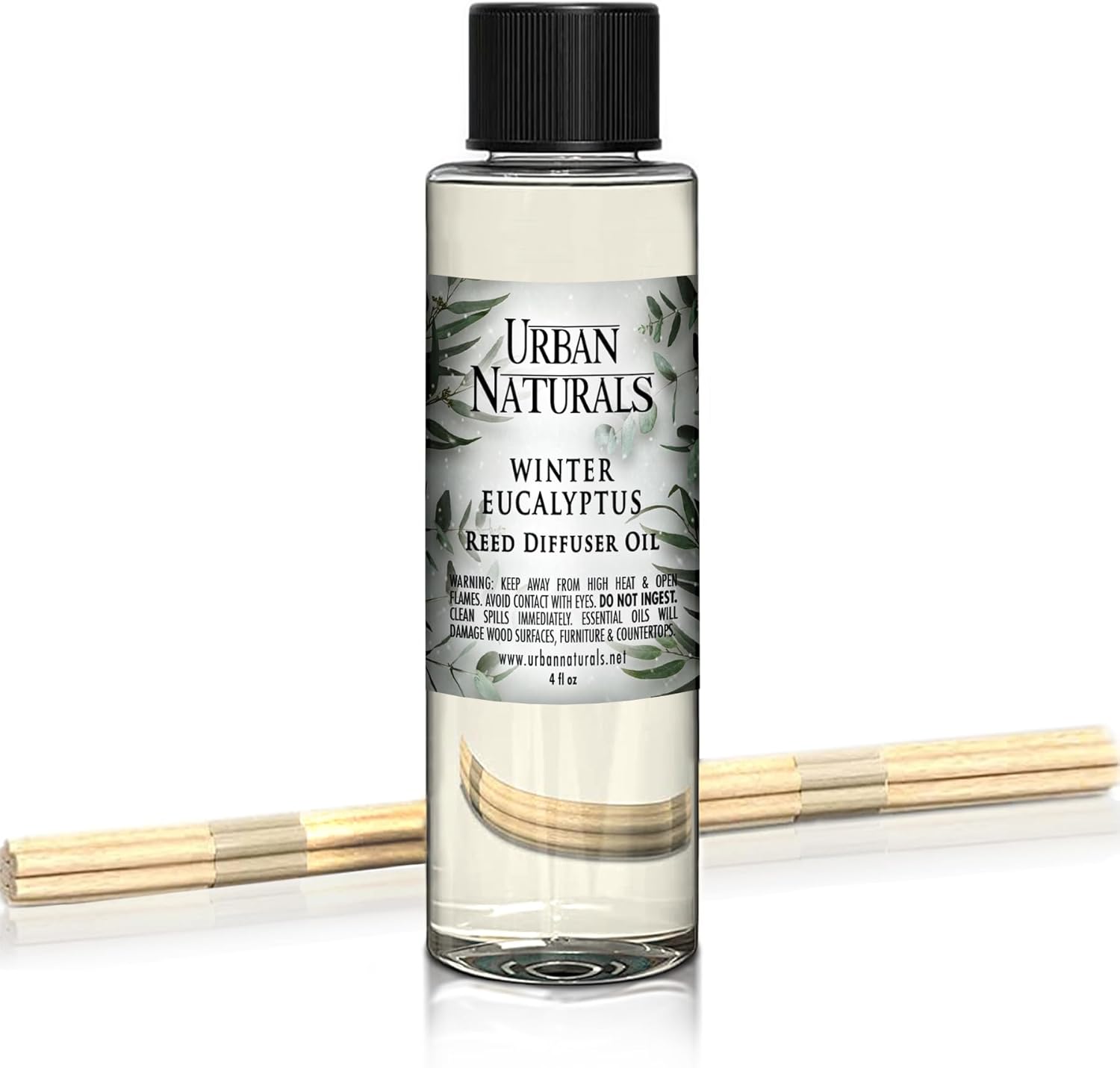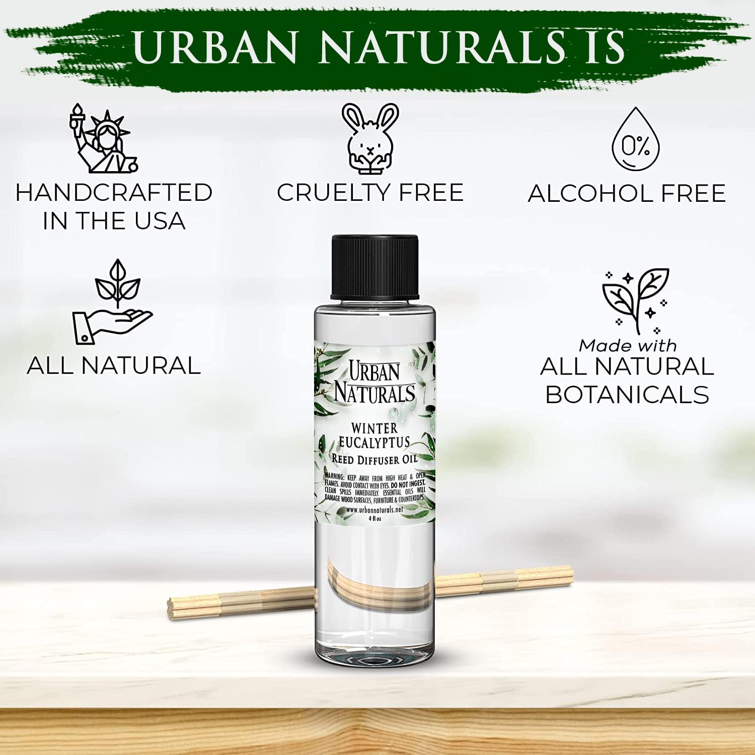 Urban Naturals Reed Diffuser Oil Refill Winter Eucalyptus, Crisp Eucalyptus, Mint, Spruce, Cedar, Essential Oils, 4 oz + Free Reed Sticks, Made in The USA