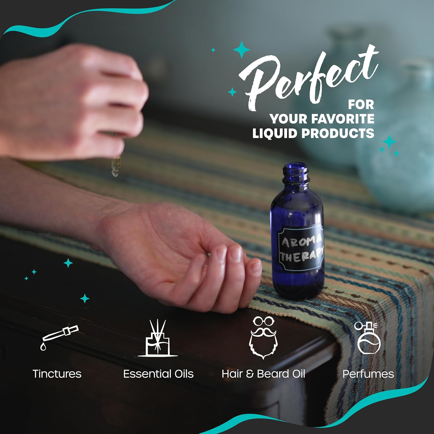 - Preserve Blends in Dark Bottles With Dropper For Oils & More: Protect your homemade blends with our blue glass dropper bottles —designed for use as apothecary bottles , mini serum bottles with dropper or mini dropper bottles for travel . Each 118mL / 4oz dropper bottle glass is leak-resistant, UV-safe & includes silicone twist caps to prevent chemical breakdown. An ideal mini oil dropper bottle 4oz bundle for everyday use, these dark glass bottles with dropper keep your mixtures fresh & ready.