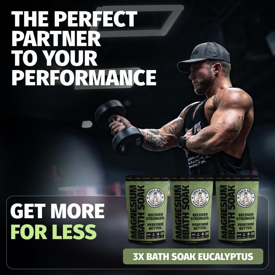 Coach Soak Recovery Bath Soak - Alternative to Epsom Salt Bath Soak - Fast-Absorbing Pure Magnesium Flakes with 21 Minerals, Bath Salts & Essential Oils - 9 lb (3 Pack) - Eucalyptus Tea Tree