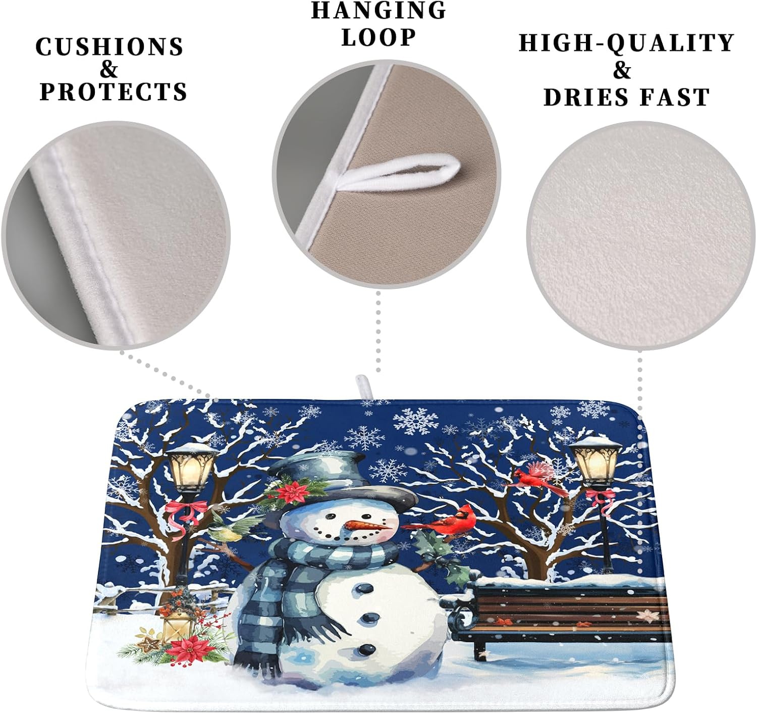 Winter Snowman Dish Drying Mat for Kitchen Counter 18x24, Xmas Snowflakes Dish Drainer Mat Snowy Night Drying Kitchen Mats Cardinal Birld Dish Pad Absorbent Reversible Coffee Mats for Dishes