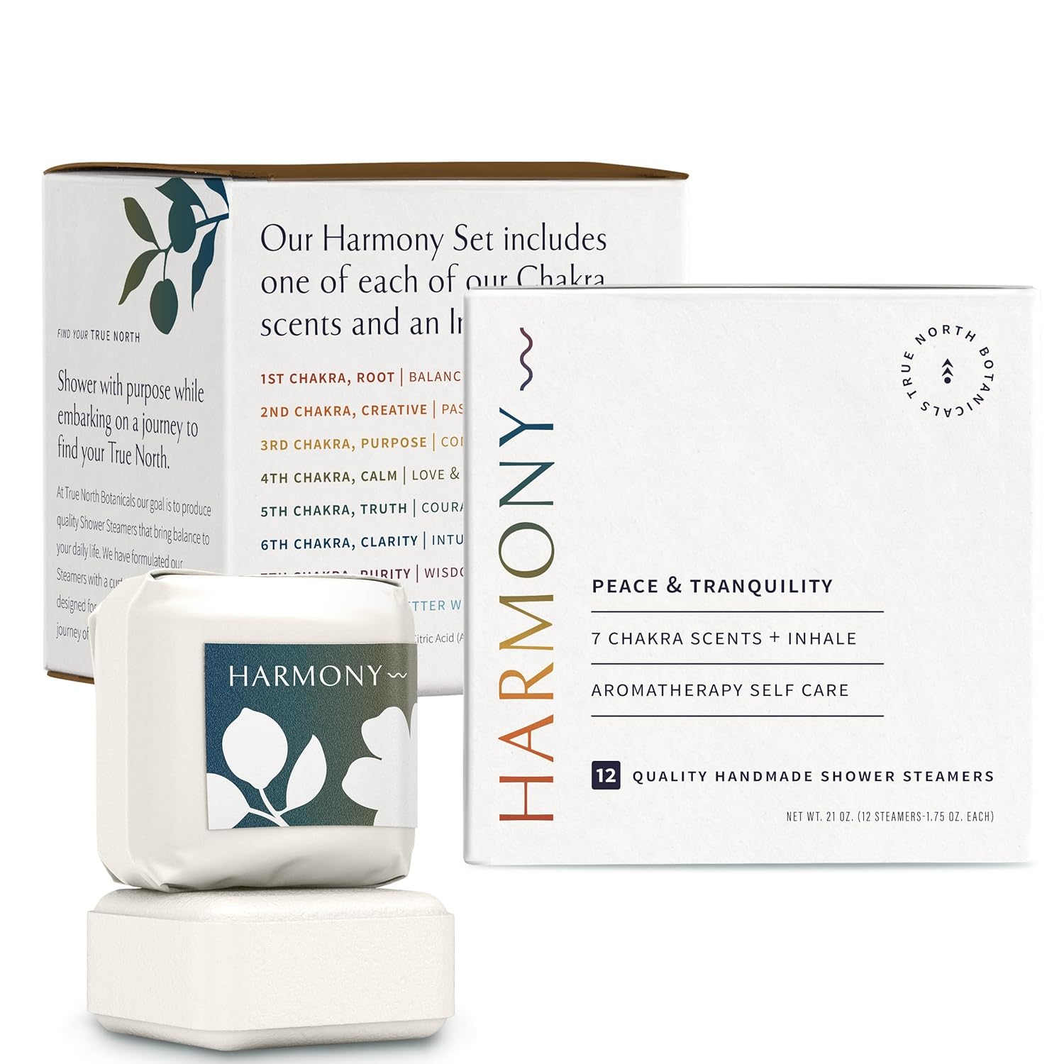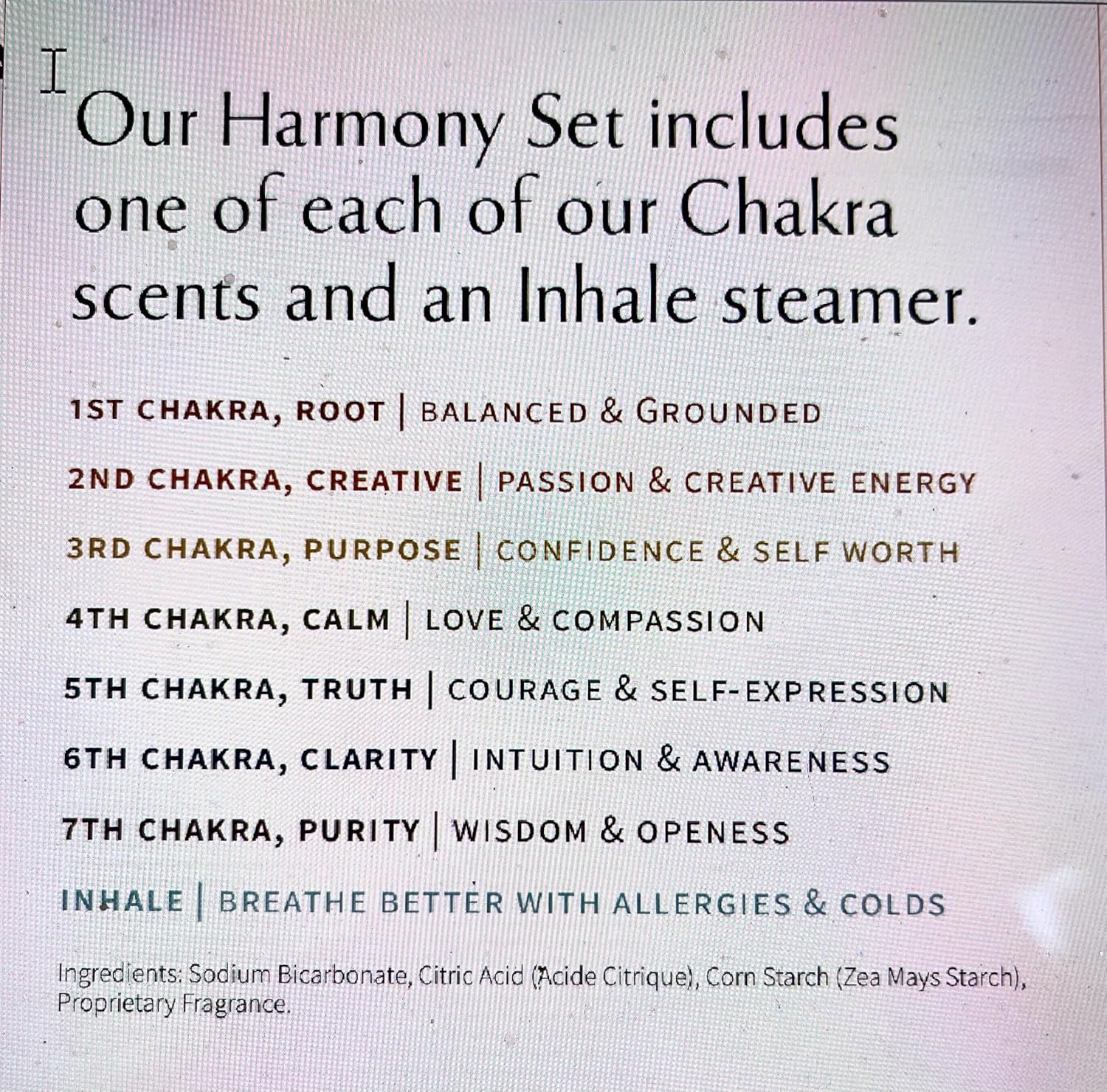 - "HARMONY" VARIETY SET (12 SHOWER STEAMER :(One of the each): 1st Chakra “Root” (Blackberry, Amber, Bergamot, Sweet Viola, White Cypress): 2nd Chakra “Creativity”( Bergamot, Sicilian Lemon, Tangerine, Lime): 3rd Chakra “Purpose”(Blueberry, Bergamot, English Thyme, Rosemary, Sicilian Lemon): 4th Chakra “Calm”(Peach, Bergamot, Gardenia, Rose): 5th Chakra “Truth”(Peach, Cedarwood, Bergamot, Neroli): 6th Chakra “Clarity”(Lychee, Yuzu Fruit, Geranium, Lily): 7th Chakra “Purity”(Lemon Verbena, Coconut)