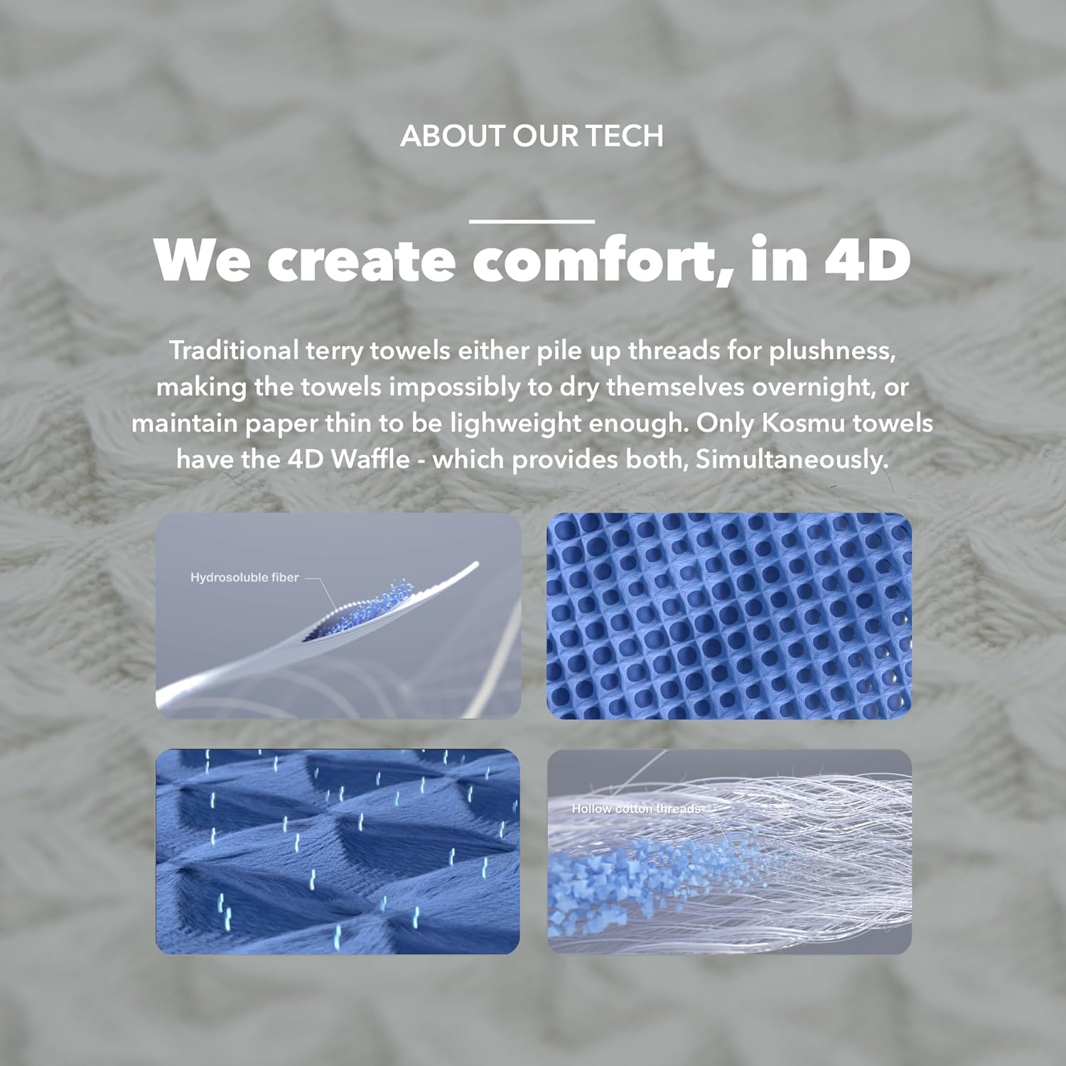 - Get bone dry every A.M.: While the waffle structure intrinsically maximizes surface exposure for airflow for guaranteed breathability, allowing the towel to dry itself out quickly, we have fundamentally improved the performance of Kosmu Towel with advanced science and technology.