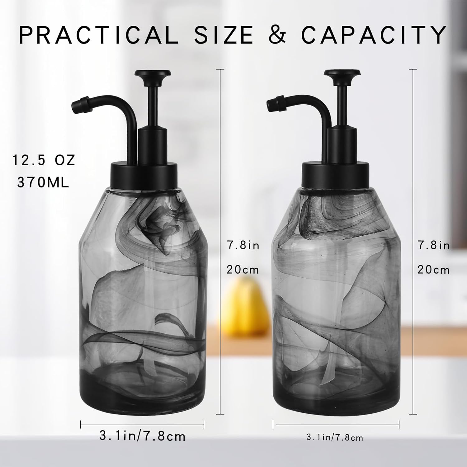 - STYLISH BLACK MARBLE GLASS DESIGN👍: Unique marble glass design, like ever changing black cloud floating in the clear glass, elegant and attractive. Black marble dish soap and hand soap dispenser with matte black pump, modern vintage design will add charm to your bland bathroom or kitchen sink decor! Also good for boho farmhouse, luxury hotel, office, B&B use.