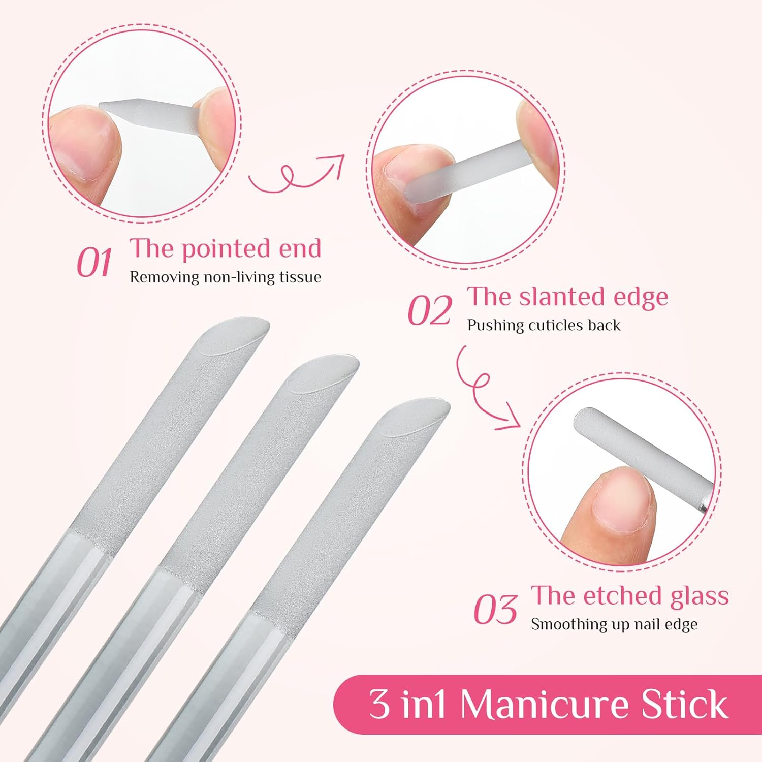 - 3 in 1 feature: this double sided glass cuticle pusher is designed for many uses; The pointed tip gently removes dead skin and dirt from nail edges, while the slanted edge is nice for pushing back cuticles and exfoliating under the nail fold; Both sides feature etched glass that smooths nails to a refined shape, promoting the growth of long, healthy, and beautiful nails.